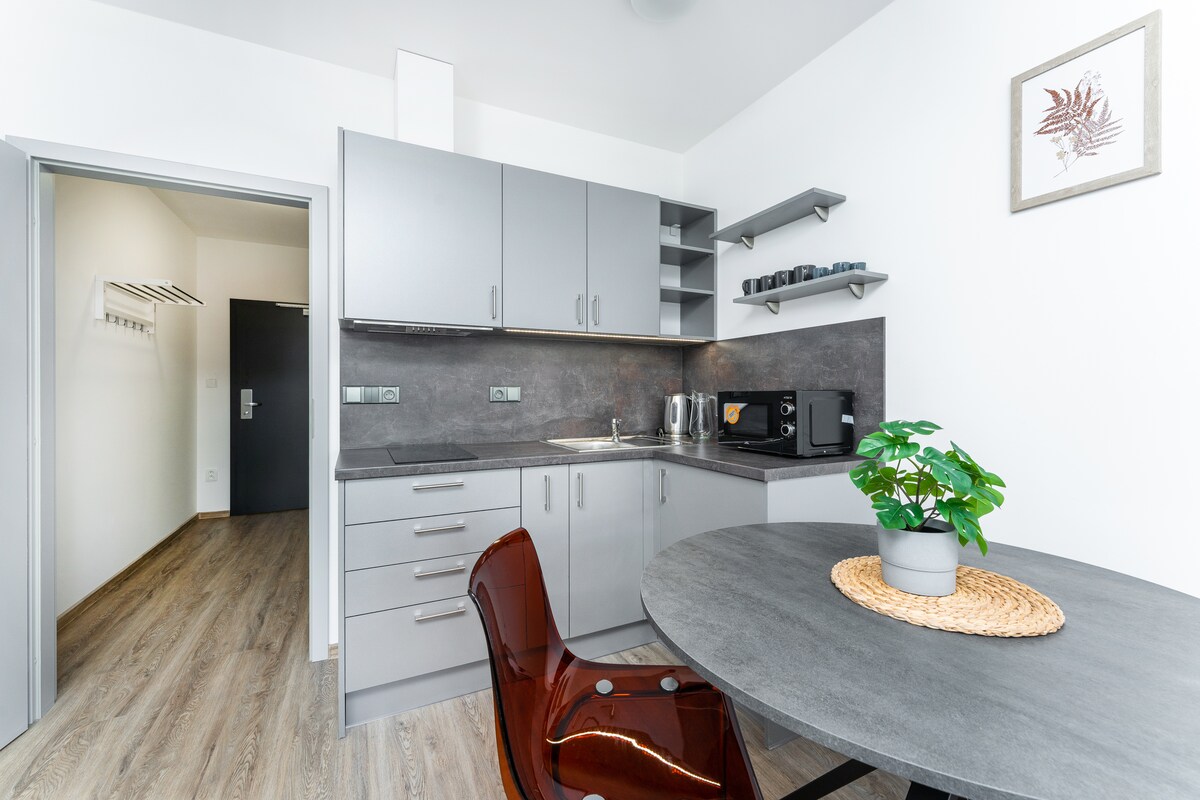 Street: Čechova 114: Apartment # 58 „Paris“ 39 m2 on the top floor of a new building with a balcony. Closed VIP floor with chip lift, 100% security, service and comfort. Air conditioning, full equipment incl. dishes and towels. 300 meters from the center - Poděbrady colonnade, 2 minutes from the railway and bus station - 55 minutes to the center of Prague. Internet 350 Mbit Up & Down without limits !!! WiFi full coverage. 4K 55''TV. Washer & dryer, dishwasher, fridge / freezer, microwave.