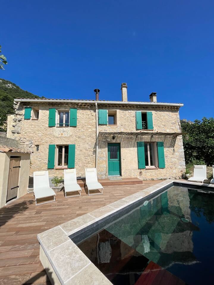 Maju, elegantna kuća koja se nalazi u Najonu, u srcu Drôme Provençalea i samo 10 minuta hoda od istorijskog centra grada, ima prijatan dnevni boravak sa otvorenom, potpuno opremljenom kuhinjom, 3 spavaće sobe (uključujući 2 glavna apartmana sa krevetima od 160 cm i privatnim kupatilima, i 1 spavaću sobu sa 2 kreveta od 90 cm i zasebnim kupatilom) i 2 toaleta. Uživajte u privatnom, zatvorenom spoljnom prostoru sa dvije terase, uključujući prostor za opuštanje i roštilj, kao i privatni grijani bazen.