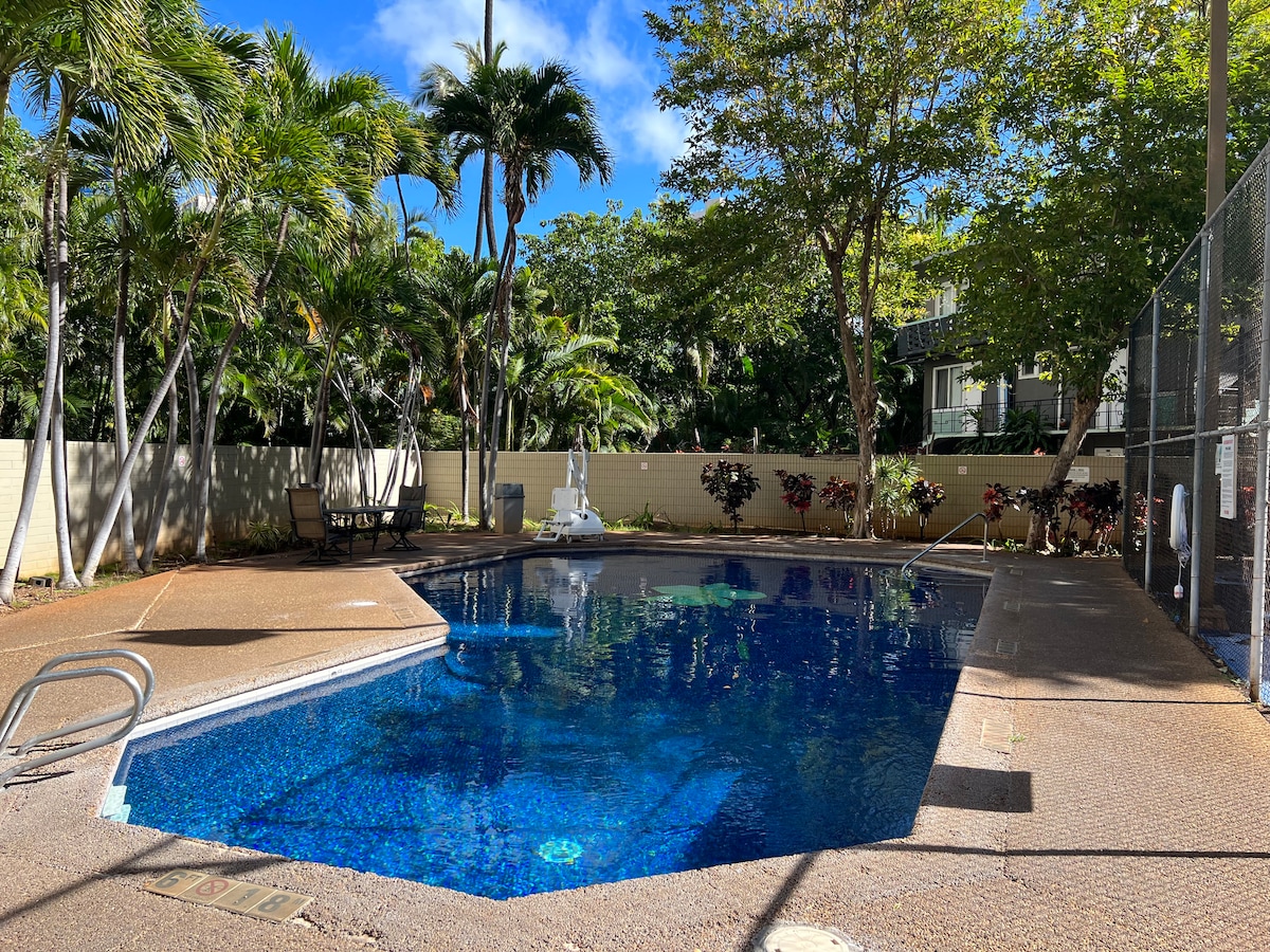 Prostran i svijetao stan samo 2 minuta hoda do plaže Vaikiki i samo 5 minuta od srca Vaikikijevih prodavnica, restorana i zabave. Naš jednosobni stan ima bračni krevet koji takođe ima pomoćni krevet ispod kojeg mogu da spavaju 3 gosta, a u dnevnom boravku se nalazi i futon za 4. gosta - jedinica za ukupno 4 osobe. Naš objekat nudi besplatan parking na licu mjesta, a platili smo i parking sa zagarantovanim mjestom ako vam je draže - odmah preko puta.