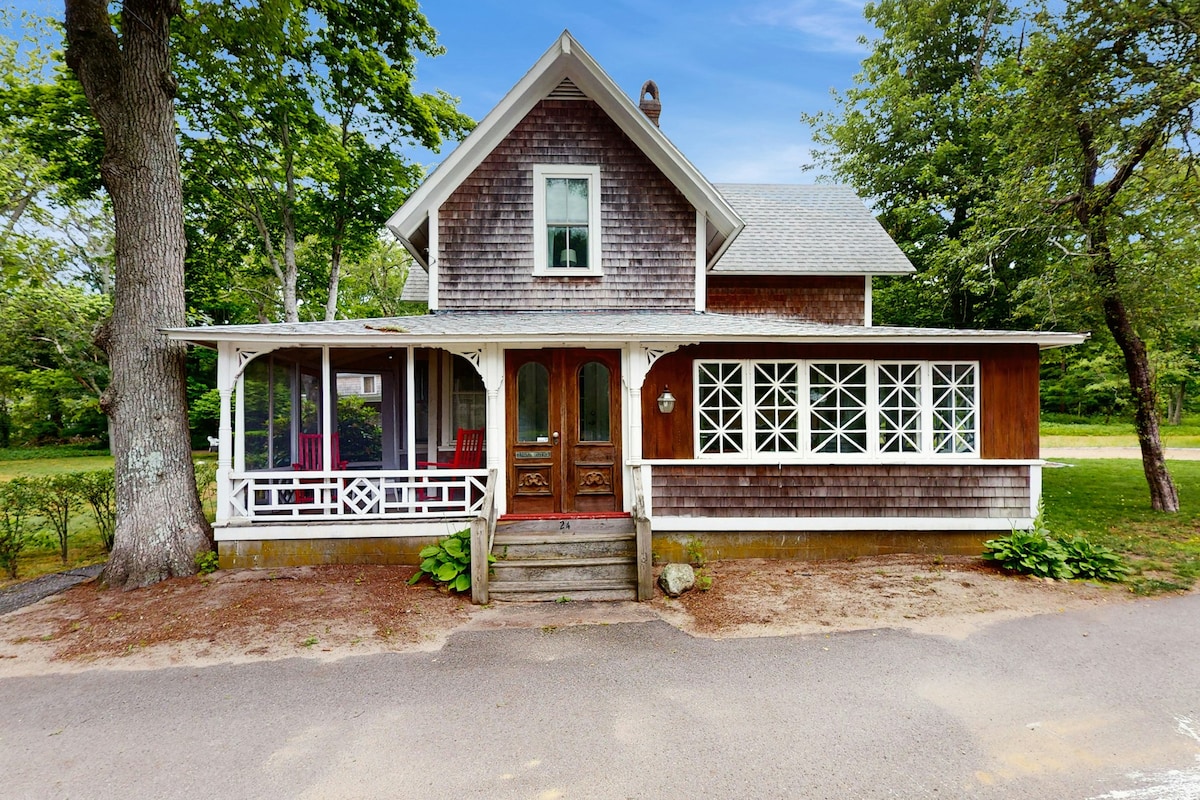 Jedinstvena prilika da odsjednete u besprijekornoj seoskoj kući u Downtown Oak Bluffsu. Sa prednjim tremom sa stolicama za ljuljanje, zadnjom terasom i roštiljem, tušem na otvorenom i klima-uređajem! - ovo je idealna oaza za odmor u vinogradu. Skrenite desno i nađite se nekoliko koraka od restorana i prodavnica u Aveniji Circuit. Skrenite levo i prošetajte 5 minuta do prelepih plaža. Sve što želite od odmora nadohvat ruke. Opustite se i zaista doživite vinograd onako kako je trebalo da bude, na adresi @WeePackemInn