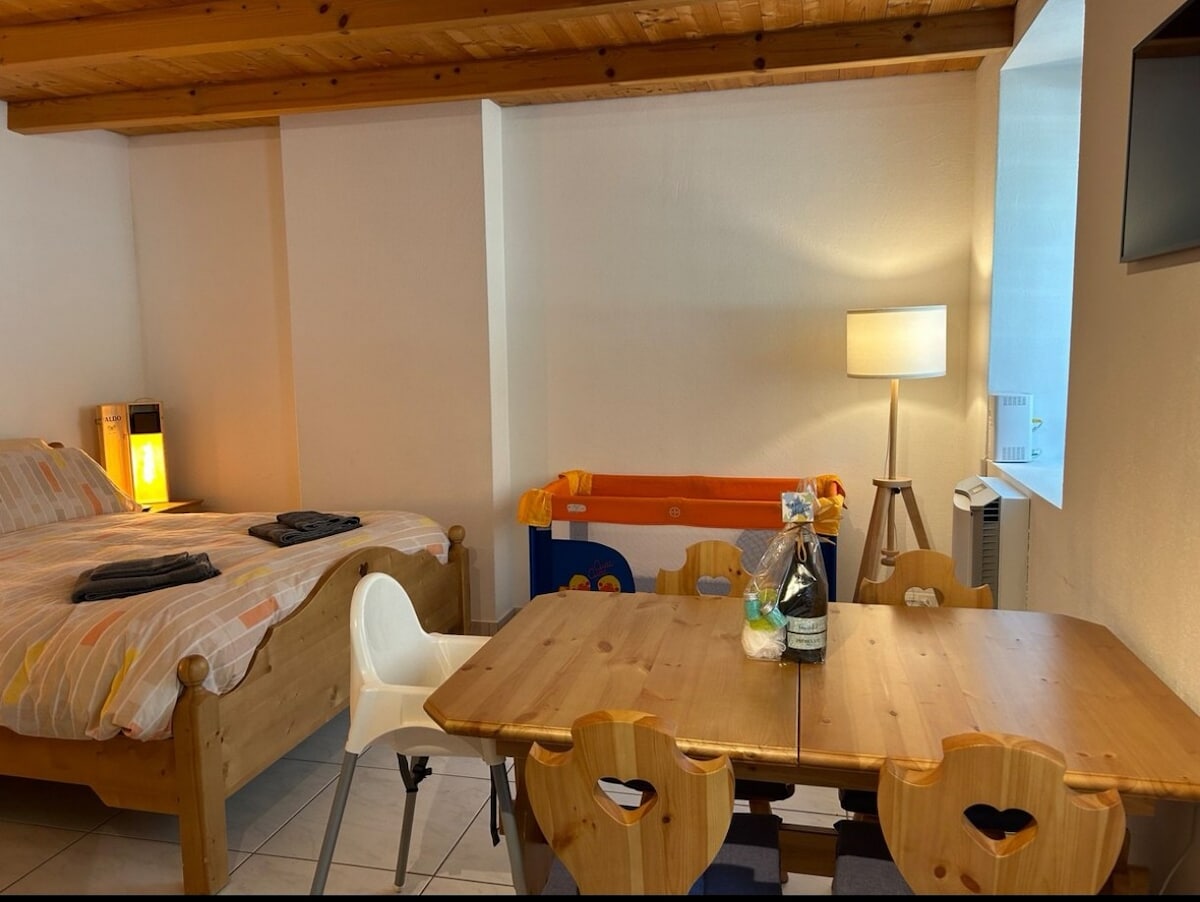 Arvenduft vam laska kada uđete u studio apartman. Jedinstveno opremljen sa puno ljubavi prema detaljima. Ručno izrezbarena drvena obloga. Ručno izrezbareni kreveti na sprat u veličini za odrasle (90 x 190 cm). Zid se proteže kašmirom. Veliki kauč, trpezarija i otvorena kuhinja. Moderno kupatilo sa tuš kabinom. Neometan pogled na planine Gornjeg Engadina sve do Zuza.