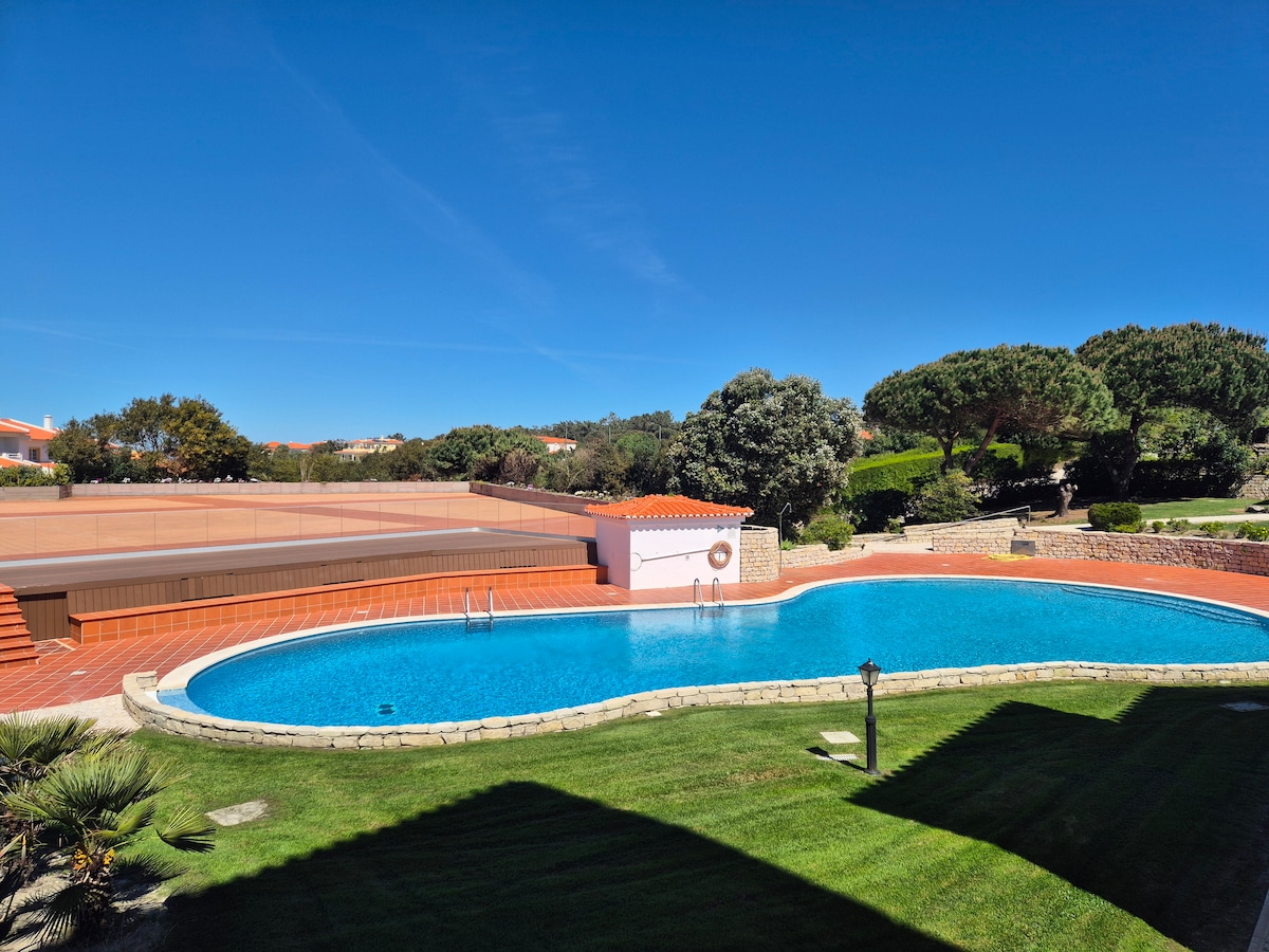 3‑bedroom apartment in Praia D’El Rey, perfect for families or friends. Located in a private condominium with pool and playground, just a short walk from the beach and golf course. Fully equipped kitchen, comfortable bedrooms (two with sea view), baby highchair and crib on request. Free parking and EV charging available. Enjoy unforgettable days surrounded by nature and the ocean!