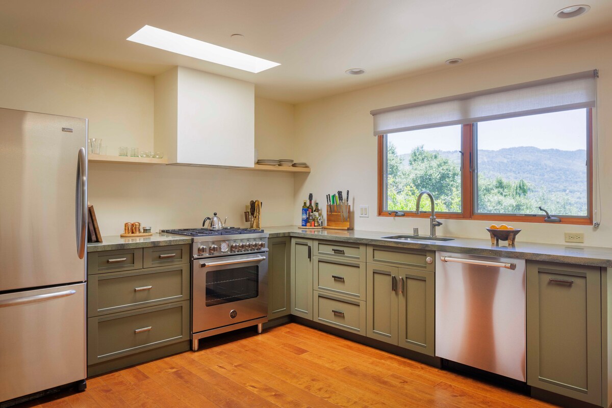 Prelijepa seoska kuća na 8 hektara u gornjoj dolini Ohai. Savršeno mjesto za romantični odmor, mirno mjesto za pisanje ili vrhunsko planinarsko utočište, sa prelijepim privatnim teniskim/krastavcem/košarkaškim terenom, roštiljem i ognjištem, vešernicom, potpuno opremljenom kuhinjom sa osnovnom opremom za pečenje i kuvanje. Knjige, igre i igračke za djecu i odrasle. Televizori u obje spavaće sobe. Pozivamo vas da uživate u vrhunskom domu daleko od doma u zaista čarobnom okruženju, prelijepoj dolini Ojai.