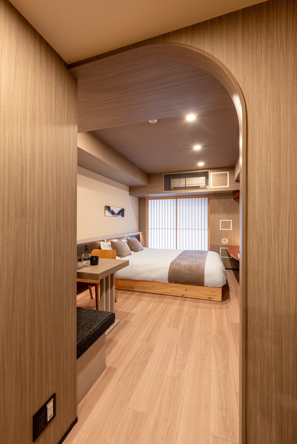 Located near Akihabara and Okachimachi with easy access to several train lines, this cozy wood-themed studio offers a calm and modern stay. The 25㎡ room includes a queen bed, desk, 55-inch TV, and printer. The kitchen has a gas stove, microwave, toaster, BALMUDA kettle, rice cooker, and cookware. A shower room, separate toilet, washing machine, and amenities are provided. Soft lighting and natural wood create a relaxing space ideal for both business and leisure.