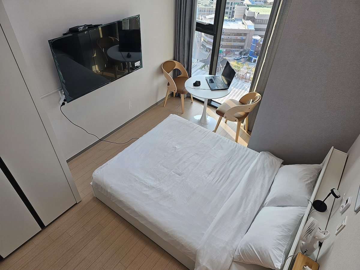 저희 숙소는 청결과 위생에 최고로 자신있는 숙소이며 호텔식 침대와 침구류로 편안하고 아늑하며 모던한 감성으로 인테리어 한 숙소입니다 도보 2분내 대형마트가 있고 교통편이 편리하여 접근성이 좋습니다 숙소 거실&주방,방1개 퀸사이즈 호텔식 침대, 원형 테이블 46인치TV 넷플릭스가능 주방 하이라이트,전자레인지,커피포트,네스프레소커피머신, 냉장고,냄비,프라이펜,수저세트,기본양념, 웰컴캡슐, 생수 제공 침구류는 매일 세탁,건조하며 수건은 인당 2장씩제공 화장실 샴푸,린스,바디워시,치약,비누,드라이기,고데기 비치 주의사항 실내 금연 숙소입니다 22시 이후 소음에 주의해주세요 체크아웃은 오전 11:00 이며 시간을 지켜 주시면 감사하겠습니다 사용하신 주방용품 설거지 후 퇴실 하셔야됩니다 예약된 인원 외 외부인 출입을 금지합니다 파손 및 심한 오염은 별도 요금이 청구 될수 있습니다 *유아동반 4인가족시 문의주세요* 오롯이 게스트님을 위한 깔끔하고 쾌적한 공간에서 좋은시간 보내세요♡