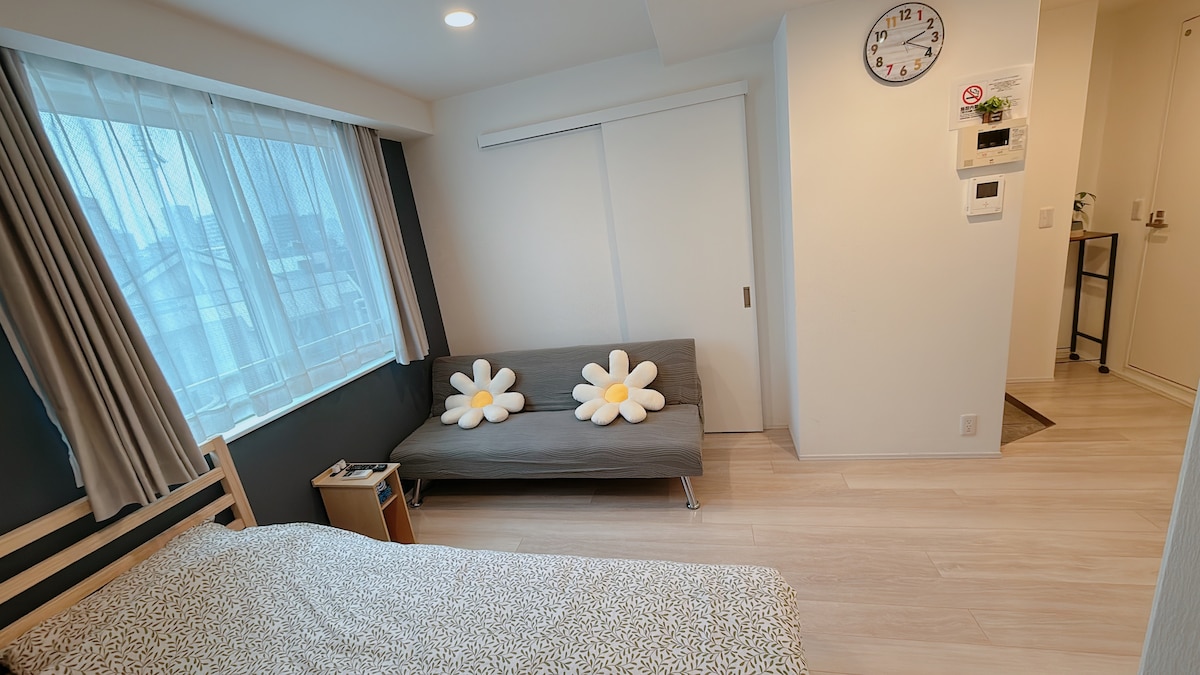 Studio apartman, koji se nalazi u oblasti Higashi-Shinjuku i Shin-Okubo, pogodan je za samostalne putnike ili parove. Otvoreni prostor ima bračni krevet, trpezarijski sto i stolice. Kuhinja je opremljena IH šporetom sa dva plamenika, mikrotalasnom rernom i drugom osnovnom opremom za kuvanje. Kupatilo i WC su odvojeni, a kupatilo uključuje garderobu i kadu. Na raspolaganju je zadnji balkon za pranje i sušenje veša.
