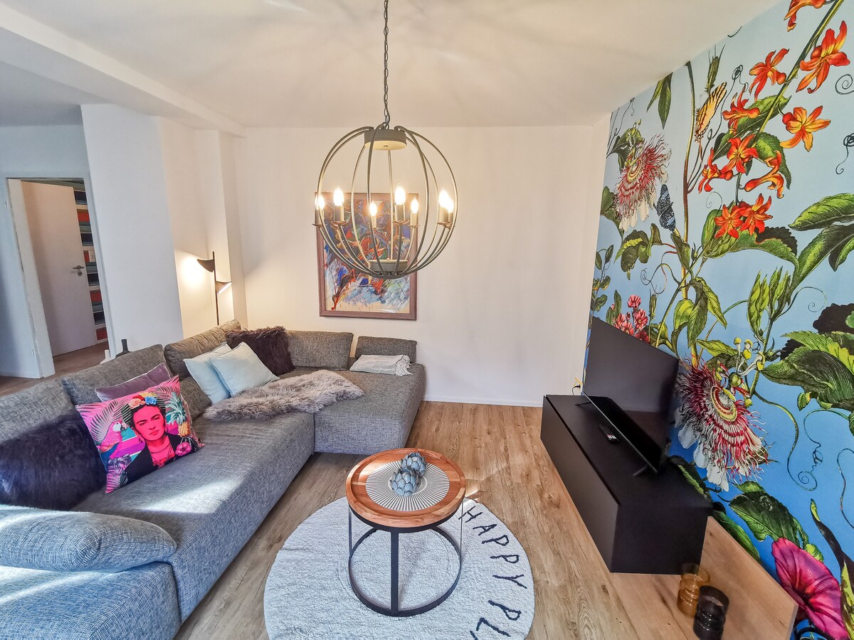 Moderne, frisch renovierte 62 m² Wohnung in Mühlacker, ideal für bis zu 4-5 Gäste (bei 5 Personen schlafen 2 Personen auf dem Schlafsofa, dafür bitte eine Anfrage stellen). Mit 3 Zimmern, einer nagelneuen Küche, hochwertiger Ausstattung und kostenlosen Basics wie Gewürzen und Tee. Der offene Wohn-Essbereich bietet eine ausklappbare Couch, Smart TV und Spiele. Ein Babybett ist auf Anfrage verfügbar. Nähe zu Einkaufsmöglichkeiten, Bahnhof und Wald. Perfekt für Familien, Paare und Naturliebhaber.