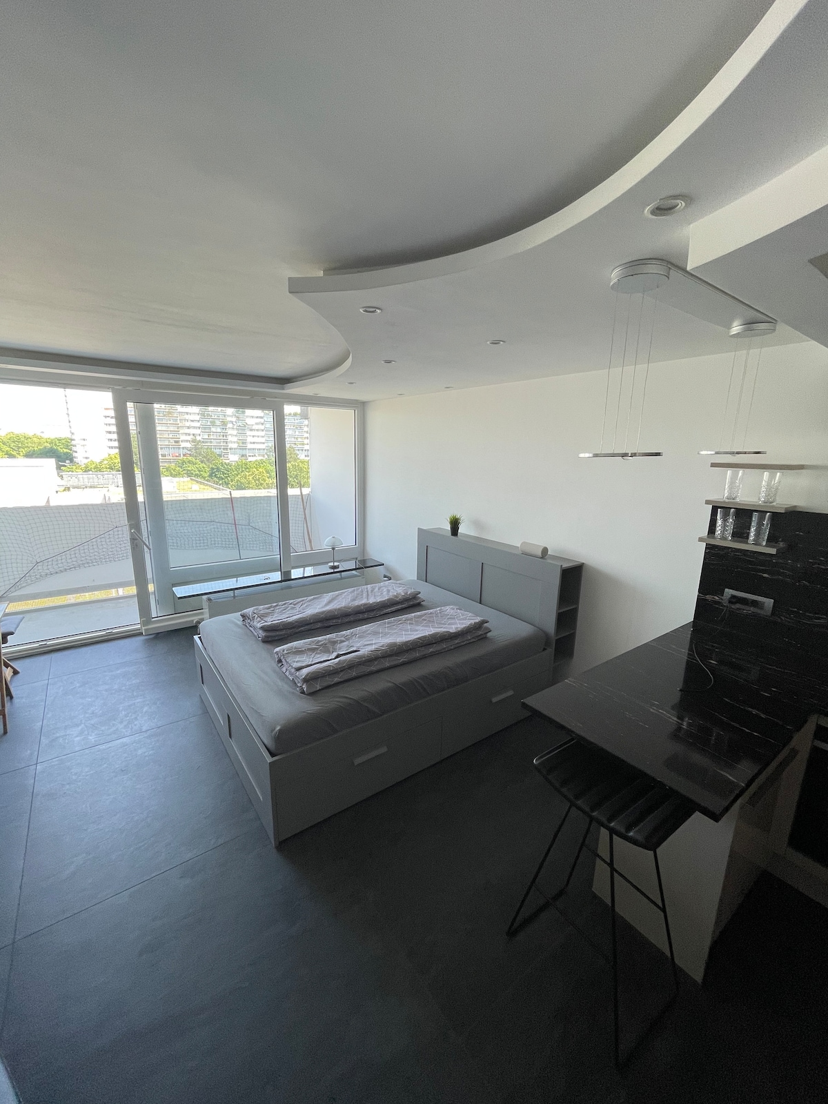 Luksuzno renoviran stan. Prostrani dnevni/spavaći prostor, mala kuhinja sa šporetom, aparatom za kafu, mašinom za pranje sudova i velikim frižiderom, kao i moderno kupatilo pružaju maksimalnu udobnost. Posebnost: pogled na zalazak sunca koji oduzima dah. Direktan pristup metrou (U1, U3, U7) kroz tržni centar (50 metara). Olimpijski park i Olimpijski stadion sa brojnim mogućnostima za rekreaciju su odmah iza ugla. Stanica za punjenje električnih automobila je dostupna.
