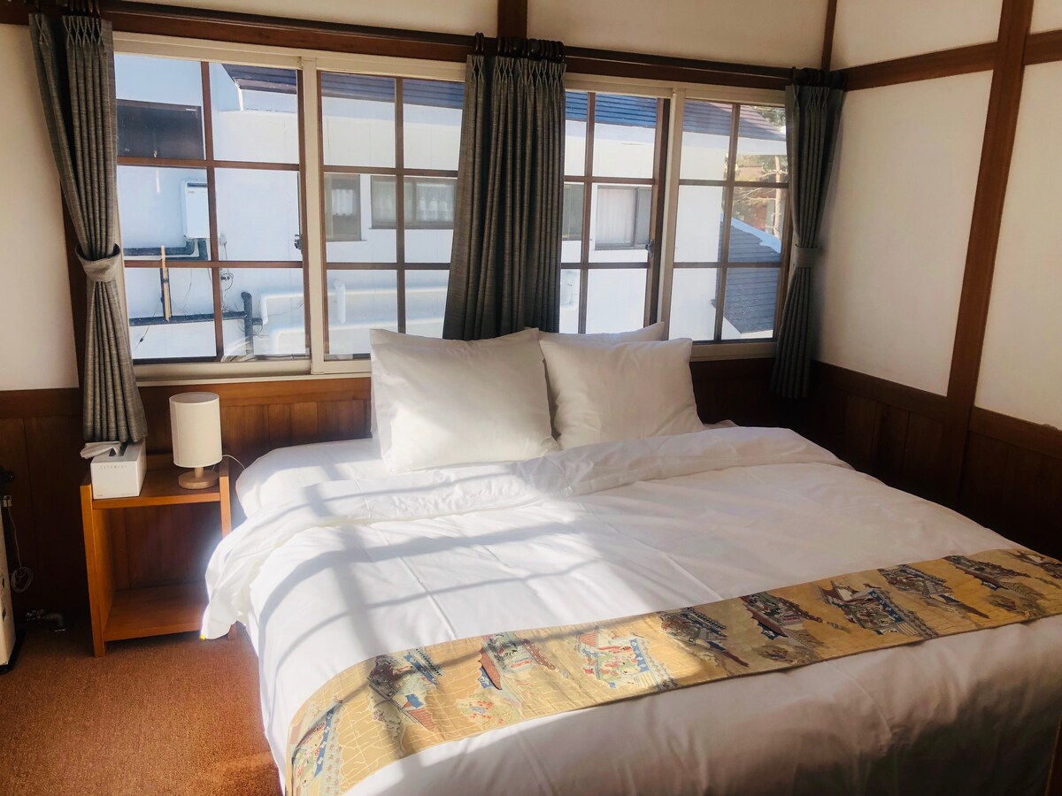全7室のうちの1室です。1階の食堂横にあり、他の6室がトイレのみ設置だったのに対し、この部屋には、シャワールームも設置しています。他の部屋よりも少し広めになっているので、セミダブルサイズのベッドが2台でもゆとりが感じられ、、ゆったりと睡眠していただけます。テレビは、43インチでwifi接続によりユーチューブも閲覧でき、音楽やスポーツ・映画鑑賞をお楽しみただけると思います。朝食は、共用スペースでもあるダイニングで皆さんと一緒にお摂りいただきます。夕食は、温泉街に行くこともできます。また、当館のメニューにより、朝の段階でご予約いただければ、おつくりすることもできます。長期滞在されても、過ごせるようにスタッフ一同心よりおもてなしするように心がけています。 生ビール、ワインやジュースを販売しています。 朝食付きですが、コンチネンタルブレックファストとなっております。玉子料理は付きません。
