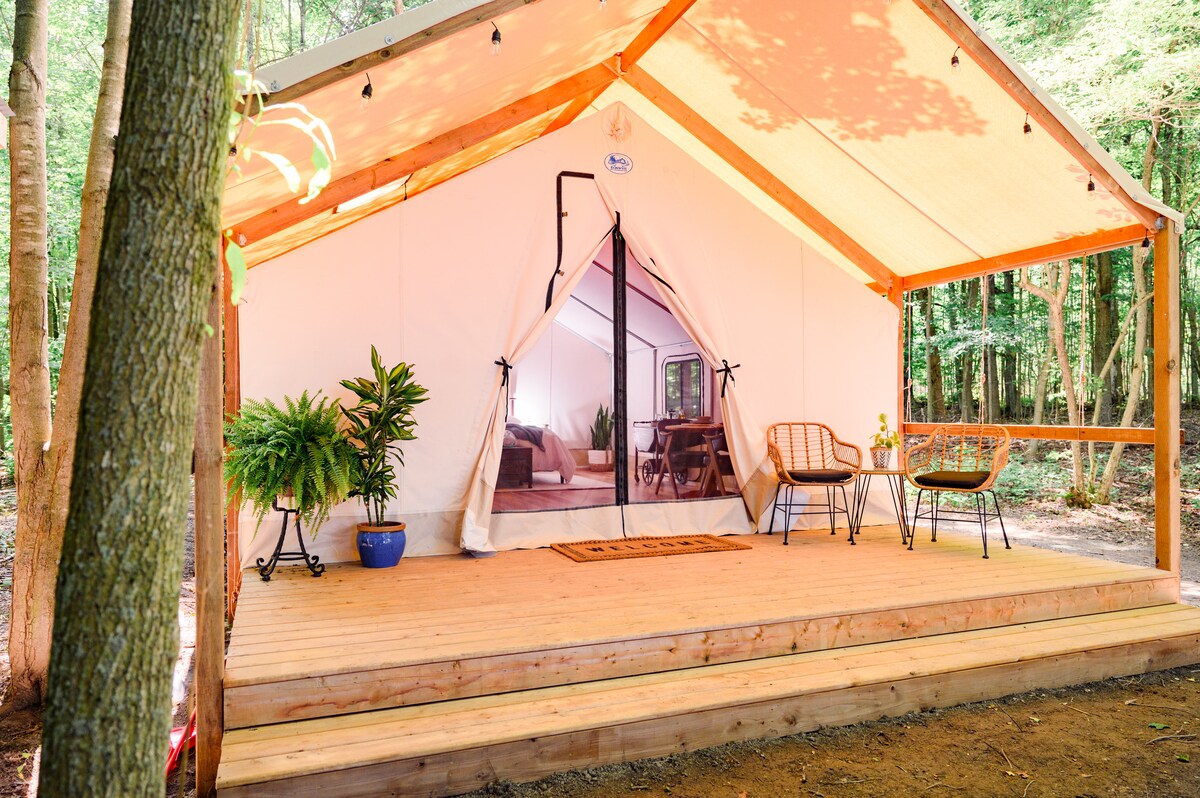 Pobegnite u začarano carstvo Vile-O'-Vispa! Dođite i uživajte u romantičnom, izolovanom odmoru u šumi na obali sopstvenog privatnog jezerceta za kupanje koje se puni iz izvora. Zaspite u rustikalnom, elegantnom glamping šatoru uz umirujuće zvuke prirode. Ovo utočište za ljubitelje putovanja je miran prostor u kojem možete da se oporavite i probudite dok se gubite među smaragdnom mahovinom, visokim drvećem i istorijskim kamenim zidinama. Napomena: Gostima koji rezervišu 3 ili više noćenja ponudićemo 15% popusta kada podnesu zahtev za rezervaciju.