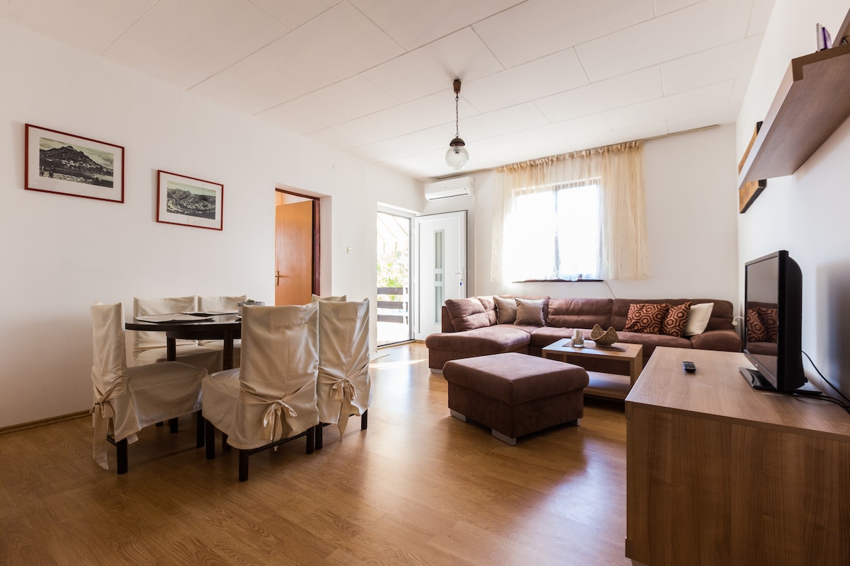 Stan se nalazi u renoviranoj tradicionalnoj kući samo nekoliko koraka od mora (5m) i oko 100-150 m od centra grada gde ćete naći prodavnice, restorane, apoteke i još mnogo toga. Gosti raspolažu celim prelepim stanom sa dve spavaće sobe, potpuno opremljenim dnevnim boravkom i delom terase. Terasa je privatna za goste naše kuće koja sadrži još jedan apartman za dve osobe. Na terasi se nalazi vez za brod. Svi troškovi su uključeni u cenu, posteljinu, peškire, klima-uređaj itd.