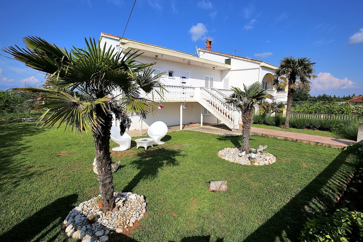 Ova prelijepa vila se nalazi u mirnom naselju i okružena je prekrasnom prirodom. Nalazimo se u blizini grada Nina i najpopularnije plaže u okolini . Grad Zadar je udaljen 15 minuta vožnje automobilom. Kuća je savršeno mjesto za veće porodice i grupe. Veoma je prostran i moderno opremljen. Vila se sastoji od pet spavaćih soba, tri kupatila, dnevnog boravka sa trpezarijom, grijanog bazena i spoljne kuhinje. Naši gosti imaju besplatno parking mjesto, WI-FI i roštilj.