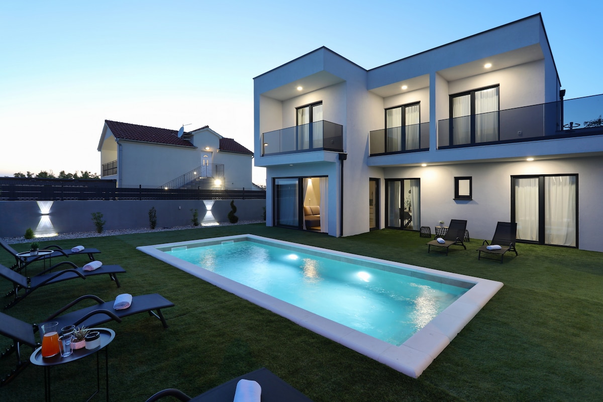 Ova potpuno nova vila se nalazi na mirnoj lokaciji i okružena je prelijepom prirodom. Vila se sastoji od 4 spavaće sobe, dnevnog boravka sa trpezarijom, potpuno opremljene kuhinje, tri kupatila, terase , parking mjesta i grijanog bazena. Sve sobe su klimatizovane, a jedna soba ima privatno kupatilo. Kuća se nalazi 10 minuta vožnje od najpopularnije pješčane plaže i 10 minuta od gradova Zadra i Nina. Restorani i prodavnice se takođe nalaze u blizini smještaja.