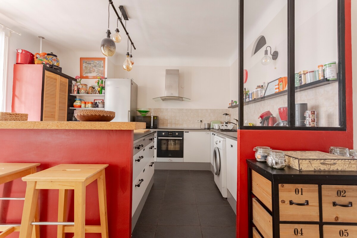 Appartement T2 de 50m2, au deuxième étage d'un immeuble ancien au cœur du centre-ville, en zone piétonne, à Toulon. Quartier vivant et convivial, bars à vin, restaurants, commerces et magasins, galeries, au pied de l’immeuble! Il se compose d'une belle pièce de vie, salon avec 2 canapés (dont un canapé lit) et salle à manger, d'une cuisine équipée et d'une grande chambre (lit 160cm) avec salle de bain (baignoire) et toilettes. Vous serez à 10 mn à pied de la gare, 2 mn des bus et bateaux