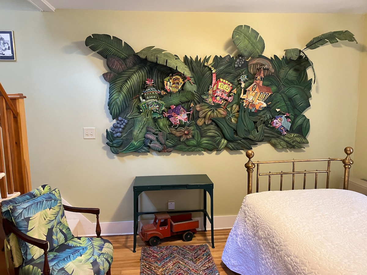 Smješten u ljupkoj bašti od 3 hektara, naš Airbnb je udaljen 1/4 milje od jezera i 23 minuta od Dartmut koledža ili skijaškog puta. Ovaj privatni, udobni stan izgrađen je na našoj kući sa sopstvenim ulazom, drvenim podovima, toplotom koja zrači, velikim prozorima, kuhinjom i kupatilom i prelijepim pogledom na baštu. Potkrovlje ima 3 velikodušna poluprivatna prostora za spavanje sa 2 kraljice + 1 bračni krevet. Dole je bračni futon. Iznajmljivanje uključuje propusnicu za područje za rekreaciju i plažu na Ostrvu s blagom: 1,5 milja.