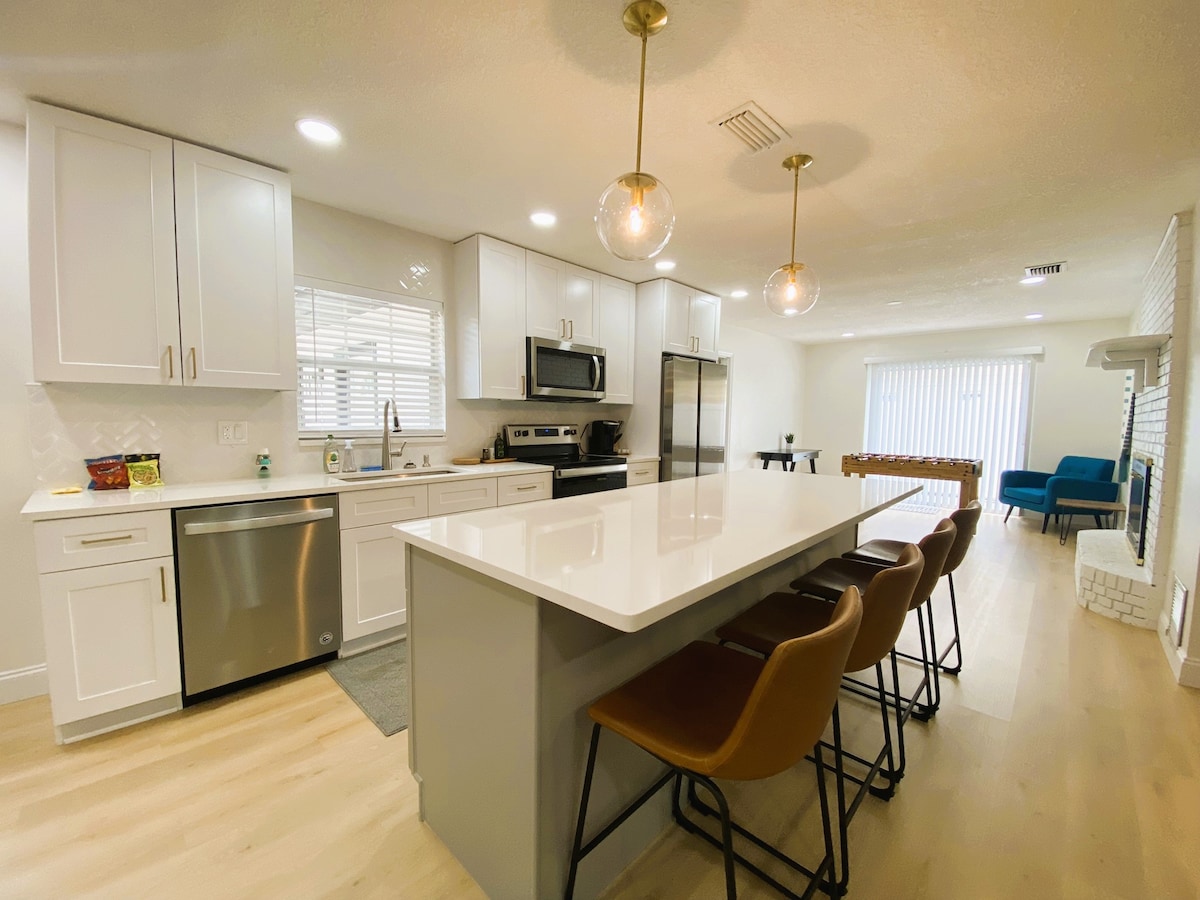 Relax with the whole family at this Stylish Magazine Style house in Davenport, just miles from Disney World Orlando Florida Theme Parks, Universal Studios, Sea World and Legoland. Enjoy our PRIVATE POOL and optional WATER HEATER & GRILL. 4 bedrooms, 2.5 bathrooms, fully equipped kitchen, Smart TV's and strong Wi-Fi all around the house. Themed Games Room in the Garage with Smart TV, Full Size Pool Table & Air Hockey. Close to Posner Village Outdoor Mall, Restaurants & Retail stores.