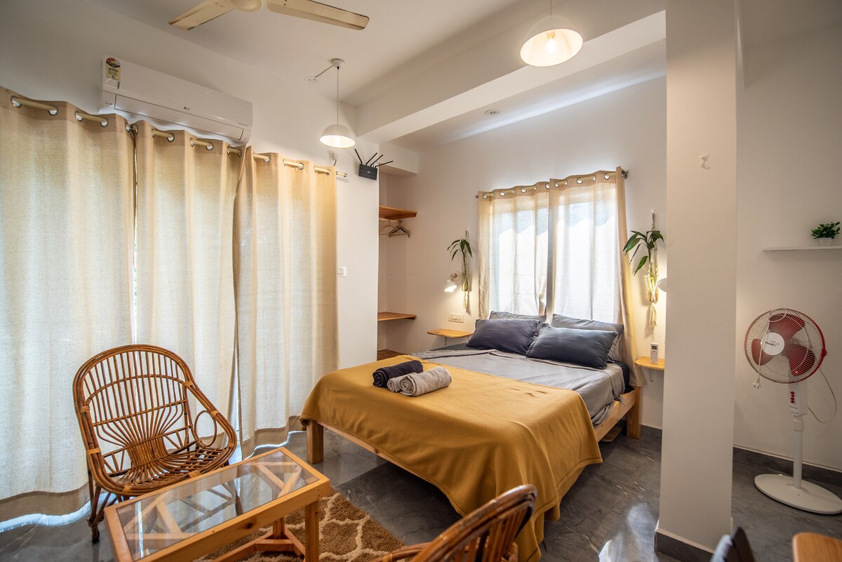 Ovaj udobni studio apartman u blizini kamenoloma Ašvem smješten je u mirnom selu u džungli. Samo 5 minuta od plaže Ašvem i plaže Mandrem, a na dva minuta od kamenoloma Mandrem, nudi savršen spoj spokoja i praktičnosti. Smješten u mirnom susjedstvu, studio je takođe u blizini lokalnih restorana, što čini objedovanje jednostavnim i prijatnim. Ima kupatilo sa sobom, potpuno opremljenu čajnu kuhinju, pristup internetu i balkon. Udoban krevet je idealan za putnike koji putuju sami ili parove.