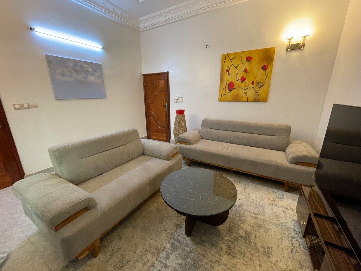 Opustite se u ovom mirnom i elegantnom domu. Svi troškovi kao što su Wi-Fi, voda, plus pretplata na kanal i punjenje gasom su na moj trošak, osim struje koja je odgovornost klijenta Napomena: za svaki boravak se očekuje depozit od 50.000 FCFA ili 76,22 evra više od 3 dana, ovaj depozit se može refundirati u celosti ako je sve u redu na kraju boravka Hvala