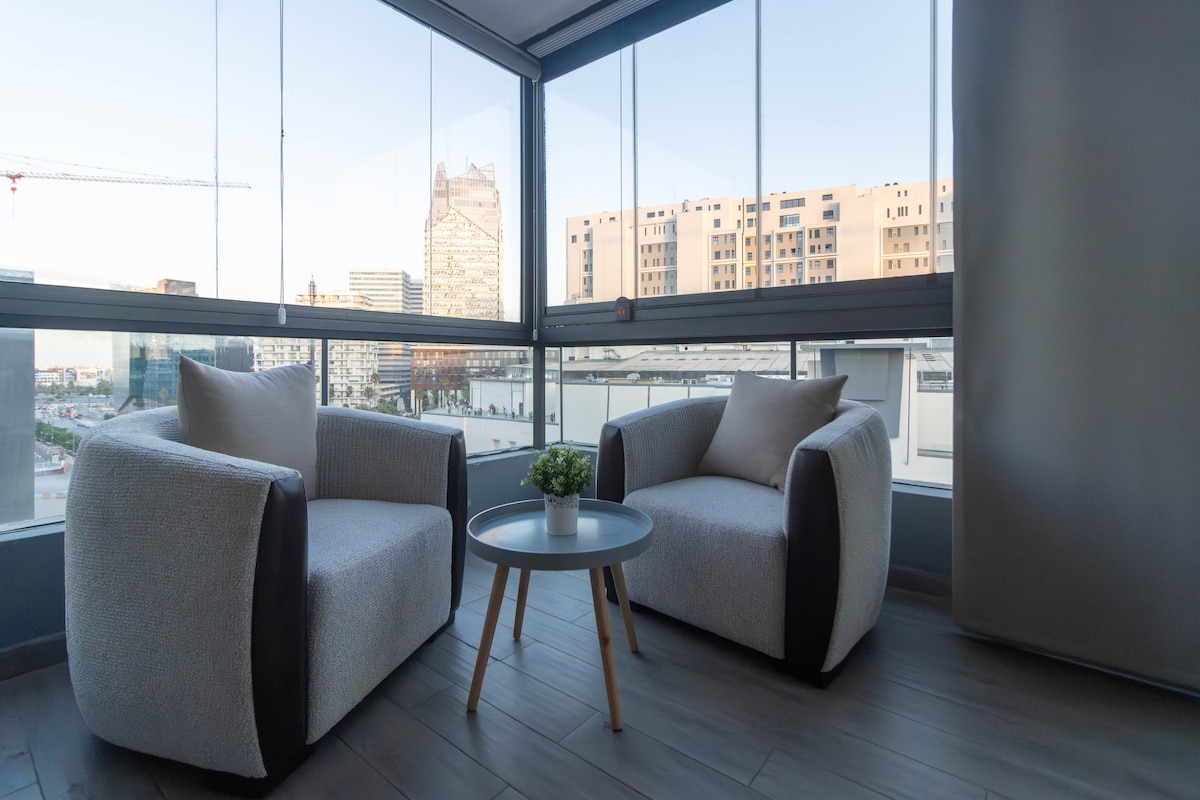 Odsjednite u prostoru od 90 m² koji je ukrasio poznati arhitekta, prostran, svijetao i savršeno opremljen. Uživajte na panoramskoj terasi idealnoj za trenutke opuštanja sa zadivljujućim pogledom na Casa. Luksuzna rezidencija: moderna teretana, zelene površine, igrališta, 24-satno obezbjeđenje. Vrhunska lokacija: u srcu CFC-a, u blizini AeriaMall-a, kafića, krovova, supermarketa, autobuske staze. Idealno za profesionalce i turiste u blizini sjedišta multinacionalnih kompanija, banaka, konzulata.