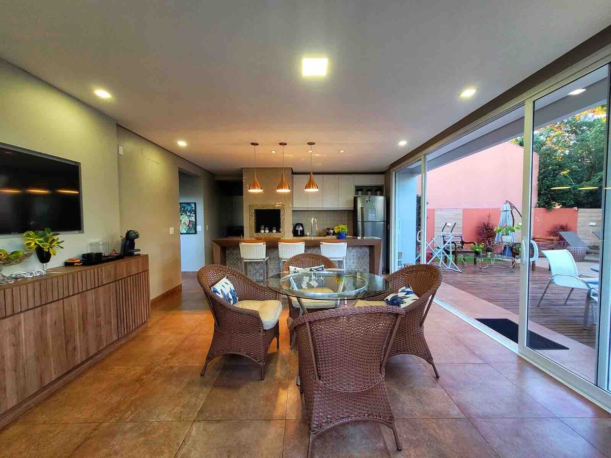 Casa completa com 3 quartos, sendo uma suíte, camas QUEEN, ar condicionado em todos os ambientes! Internet super rápida, Tv Smart de 55 polegadas. Possui todos utensílios para fazer as suas refeições e inclusive churrasqueira e fogão a lenha. Nessa casa fomos muito felizes! Fizemos todos os móveis com muito carinho! Será um prazer receber