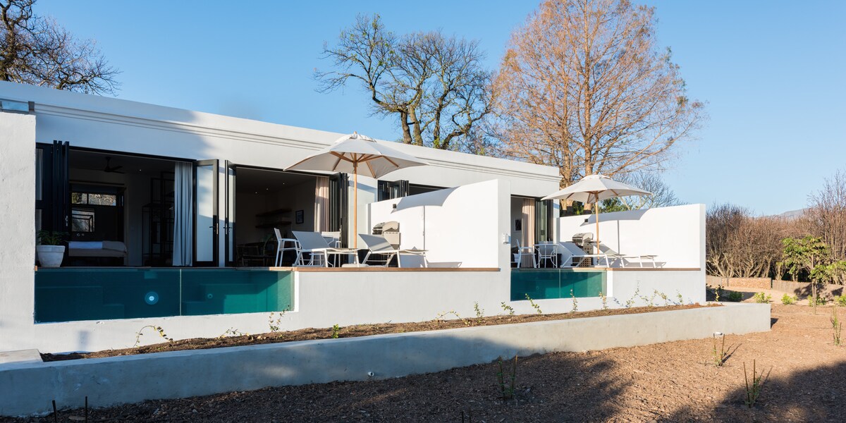 Ova moderna, prostrana seoska kuća nudi sve što vam je potrebno za savršen odmor ili kratak odmor. Zapanjujuća bašta sa bazenom. Unutrašnja/spoljašnja braai soba sa trpezarijom i namještajem za opuštanje. Potpuno opremljena kuhinja sa modernim ugradnim šporetom, Nespresso, aparatom za kafu, mašinom za pranje sudova, mašinom za pranje veša i mašinom za sušenje veša. Spavaća soba s bračnim krevetom i dovoljno izgrađenih ormarića i kupatilom u apartmanu. Udoban salon. Veliki Smart TV, koristite sopstvene aplikacije za striming. Brzi Wi-Fi. Manje od 1 km od centra grada i litice.