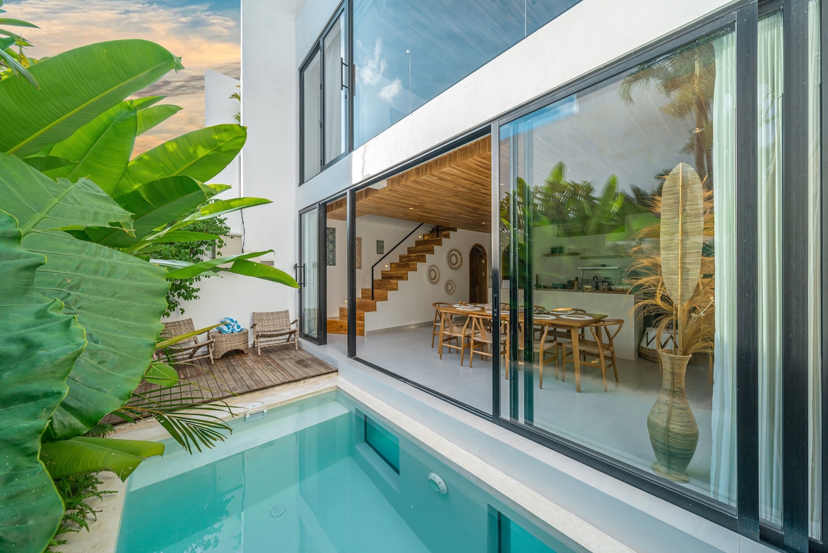 Unwind at our brand new tropical modern villa in the heart of Bingin. 🏝️ 5-8 minutes to Bingin & Dreamland Beach 🛌 Two King beds with premium mattresses, linens, ensuite bathrooms, rainfall showers & blackout curtains 🌅 Rooftop Sauna, Plunge Pools & Loungers with breathtaking sunset views over Uluwatu 🌴 Private pools surrounded by lush tropical greenery ❄️ AC enclosed living spaces, with sliding doors to let in the ocean breeze 🍽️ Fully equipped kitchen, board games & charming dining nooks