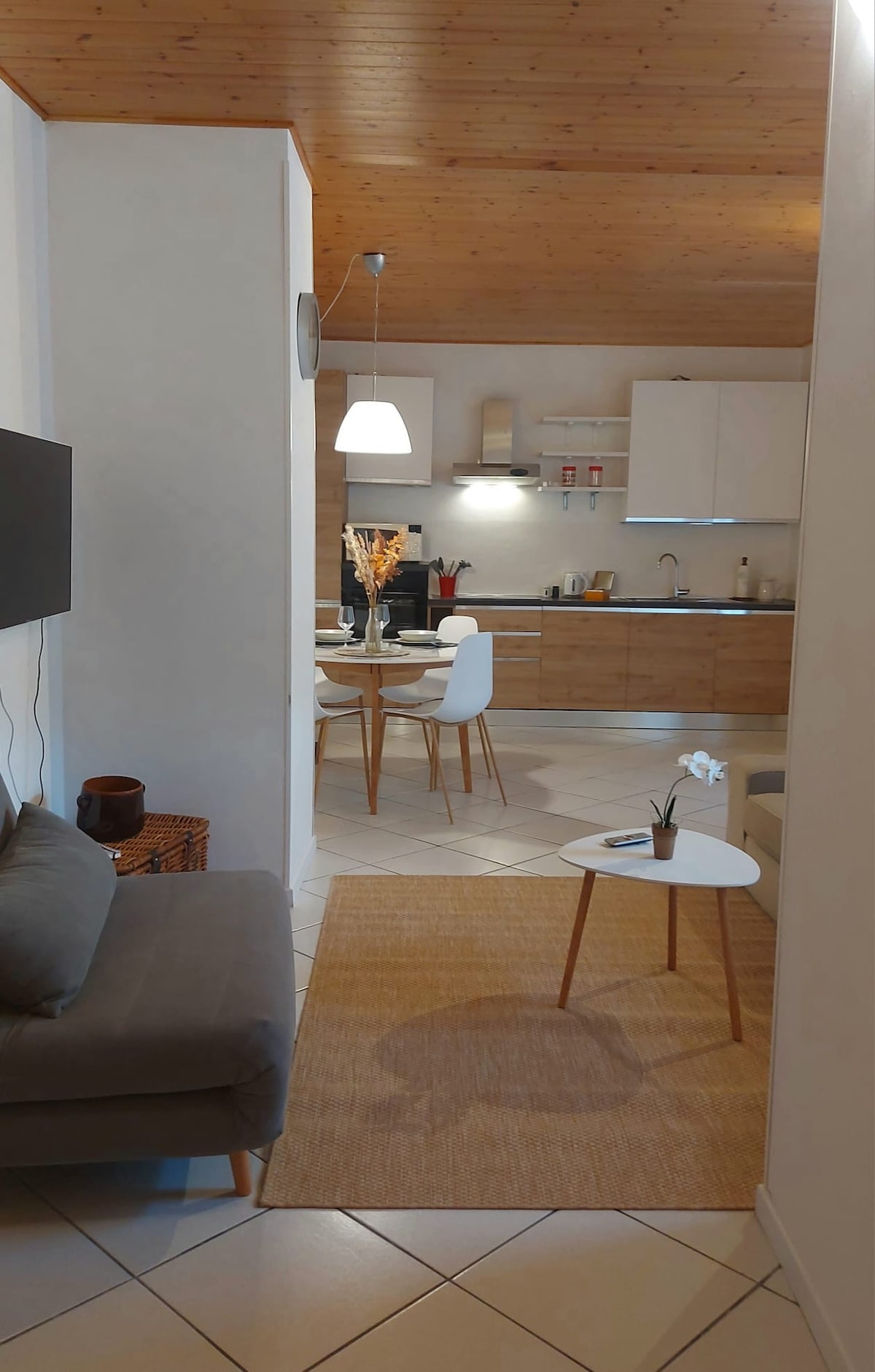 Simpatico spazio abitativo open space, dotato di angolo cucina, con tutte le attrezzature, lavastoviglie (con detersivo), microonde, bollitore. Zona soggiorno con divano e TV. E' presente un grande bagno con doccia e asciugacapelli. L'ospite troverà lenzuola (con cambio settimanale), asciugamani (con una sostituzione nel corso della settimana), tovaglie e tutto il necessario per l'igiene ambientale. Comodo parcheggio in area recintata privata adiacente alla abitazione e spazio per biciclette.