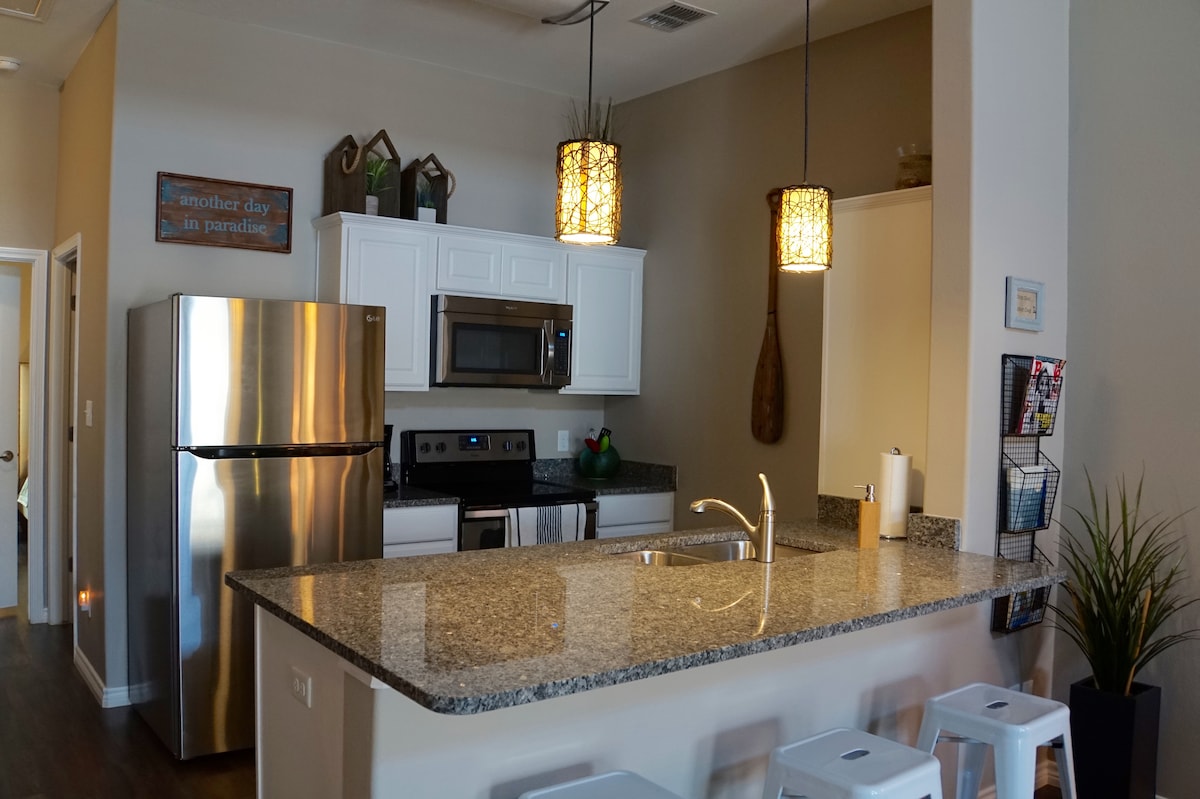 KORACI OD PLAŽE! LUKSUZNO postavljeni u prostranom, svetlom i modernom stilu, svaki detalj smo učinili savršenim. Najlepši izlazak sunca koji ćete ikada videti čeka vas svakog jutra. Svake noći, prelepo sunce zalazi iznad Laguna Madre! Vaš smeštaj će biti podjednako inspirativan. Naš stan u prizemlju (bez stepenica!) je predivno opremljen, sa prostranim plafonima visokim 10 stopa, led osvetljenjem, novim nameštajem i uređajima, pametnim televizorima u svim sobama, koji se nalaze na laganoj pješačkoj udaljenosti od svega. UŽIVAJTE!