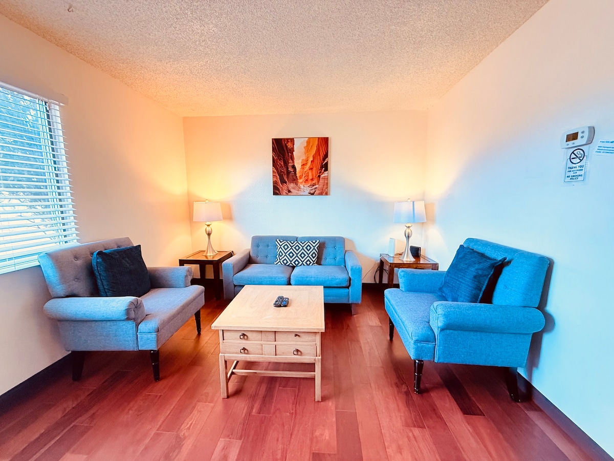 Dobrodošli u ovu dvospratnu kuću u nizu. Potpuno namješten sa 2 spavaće sobe na spratu i trpezarijom, kuhinjom i dnevnim boravkom ispod. Uključen je centralni vazduh. Pristup vešernici. Kasna prijava je dobrodošla. Vrlo miran i miran dio grada i prikladno smješten u krugu od 10 do 15 minuta vožnje od većine glavnih atrakcija kao što su potkovica i ulazi na parking na gornjoj i donjem Antilopovom kanjonu Besplatno vozilo, prikolica i parking za brod su uključeni.