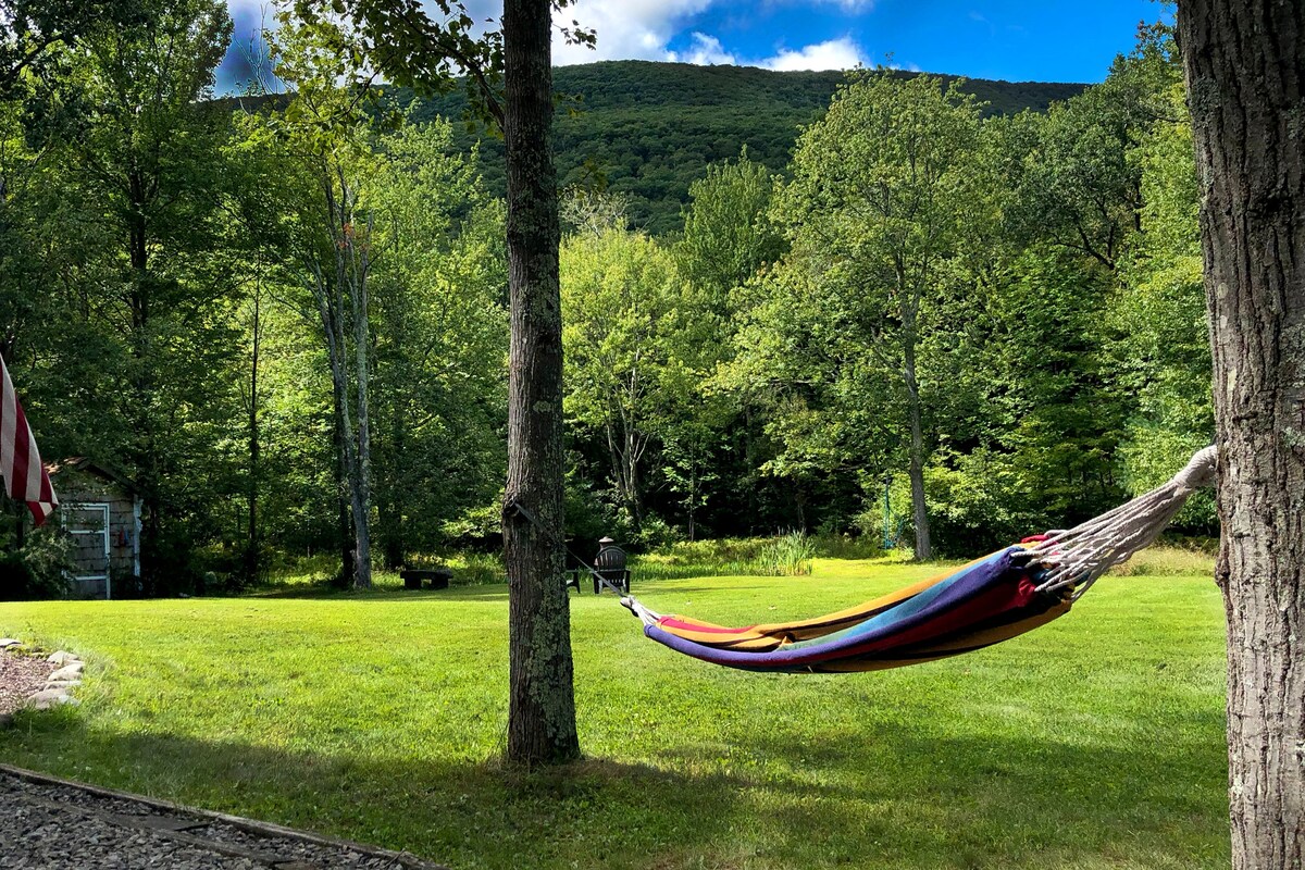 Istražite regiju Ketskil iz ove praktične kuće stare više od 100 godina. U hladnijim mjesecima, idite na razgledanje lišća, skijanje, hodanje po snijegu, kupovinu/antikvitete, a zatim se vratite kući i udobno se smjestite pored kamina. Tokom toplijih mjeseci uživajte u vožnji sajlom, planinarenju, planinskom biciklizmu ili plivanju u Kaaterskil Kriku, a zatim se opustite i opustite u našoj prostranoj sunčanoj sobi. Skijalište Hanter je udaljeno 15 minuta, skijalište Vindam je udaljeno 30 minuta, a nekoliko staza za državne parkove u Njujorku udaljeno je nekoliko koraka od ulaznih vrata.
