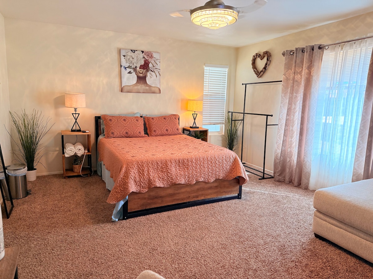 Enjoy your next stay at this newly remodeled casita with Gorgeous KING Size Bed & kitchenette, includes walk in closet, full bathroom, and conveniently located in a serene neighborhood of West Lancaster. Situated in one of the most upscale locations of Antelope Valley. This casita is minutes away from Antelope Valley College, Lancaster City Park, Center Soccer Center, General William J. Fox Airfield (WJF) AV Hospital, and Aerospace companies.