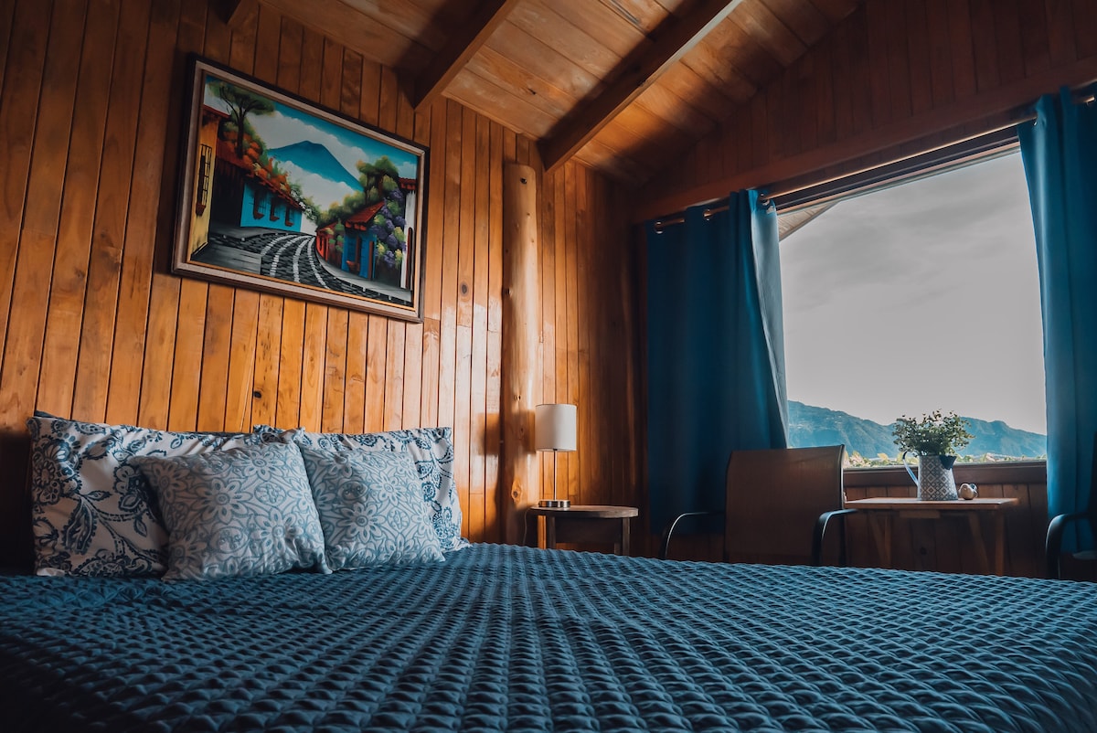 Udobna, ručno izrađena brvnara s kosim krovom i zadivljujućim pogledom Smješten na padini iznad jezera Atitlan, ovaj jedinstveni A-okvir je umjetničko, ekološki osviješteno skrovište. Okruženi bujnim tropskim vrtovima, gosti mogu da beru svježe voće i začinsko bilje dok uživaju u modernim udobnostima kao što su brzi internet, bračni krevet od memorijske pjene i tuš kabina sa padavinama na plin. Savršeno za romantični odmor ili samostalne putnike koji traže inspiraciju i mir.