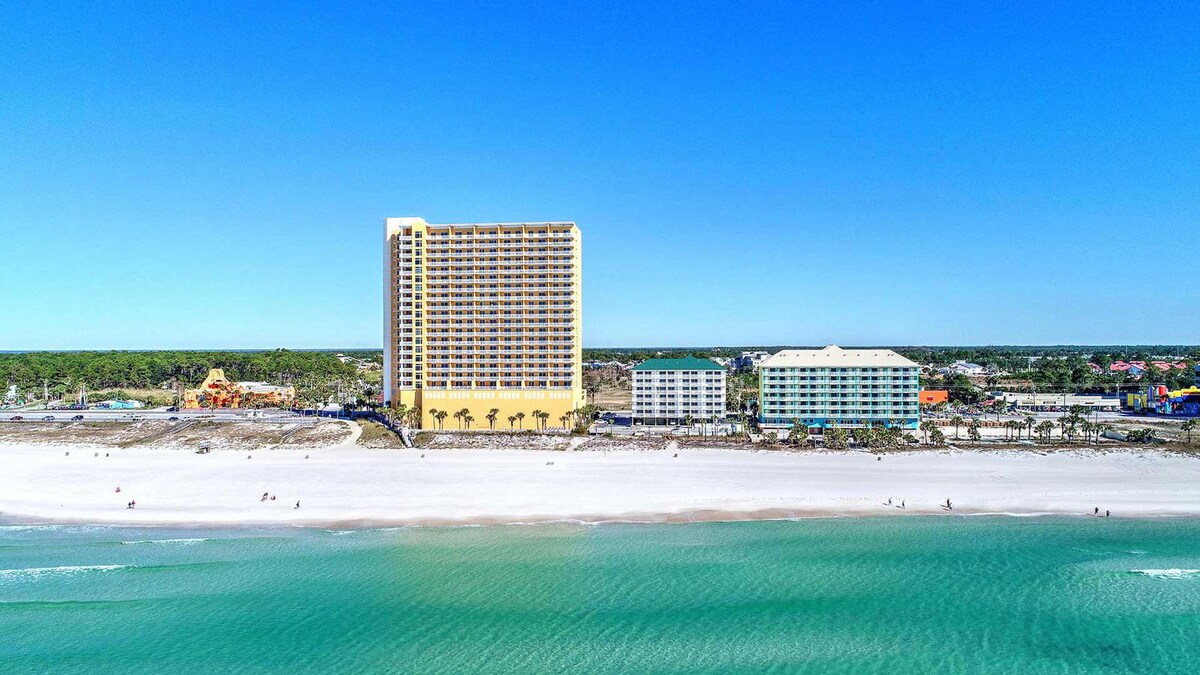 5th-floor condo directly on the world's most beautiful beach. Fully-equipped condo located at Emerald Beach Resort. Located within 1 mile to Pier Park. 1 bedroom/2 bathroom unit, sleeps up to 7. **Note: Must be 25 years of age or older to rent - 5th Floor unit - Large oceanfront balcony - 1 Bedroom / 2 Bath / Bunks / Queen Sofa Sleeper / Single Pullout - 3 outdoor pools & jacuzzi - 2 flat panel LCD TVs / Cable - High speed Wi-fi - Full Kitchen - Linens / Towels provided - Garage parking