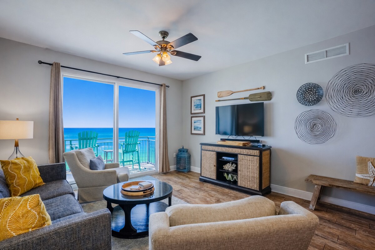 Ovaj kondominijum na uglu opservatorije od 270 stepeni na 25. spratu nudi pogled na obalu koji oduzima dah. Smještena u najvišoj zgradi u PCB-u, Tidewater Beach Resort, ova jedinstvena jedinica vam omogućava da uživate u prekrasnim zalascima sunca sa kauča ili stola u dnevnoj sobi. Noću ćete biti tretirani blistavim gradskim svjetlima s jedne strane i očaravajućom zvjezdanom svjetlošću i mjesečinom iznad okeana s druge strane. Odmaralište se može pohvaliti s nekoliko bazena, besplatnim spa centrom, teretanom i privatnim pristupom plaži