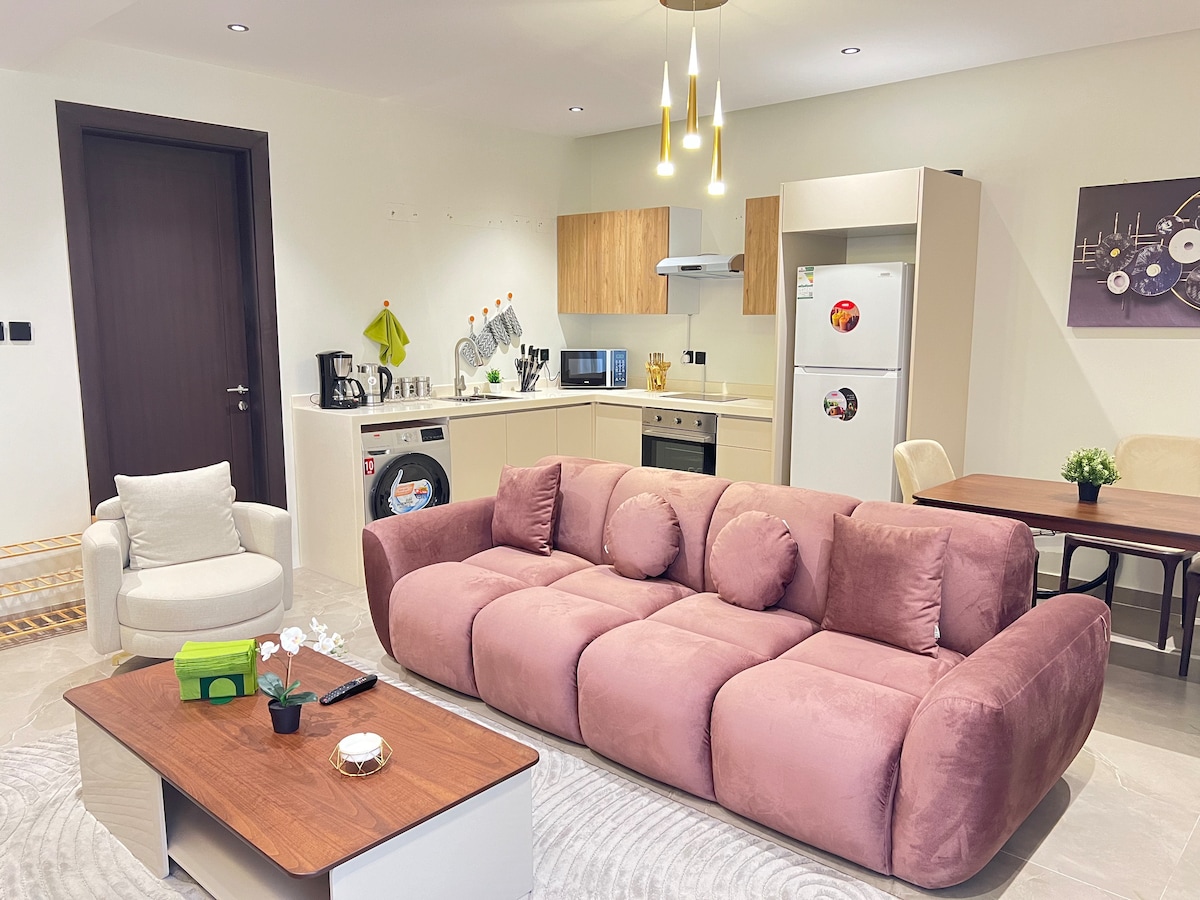 Enjoy a modern stay in Riyadh’s Olaya. This stylish apartment features a private balcony with outdoor seating, a cozy bedroom with smart separation, a comfortable living area, fully equipped kitchenette, in-unit washing machine, and workspace. Just an 8-minute walk to the metro, with Al Jazirah Hypermarket right across the street. The area is vibrant and full of restaurants and cafés—perfect for food lovers and business or leisure stays.