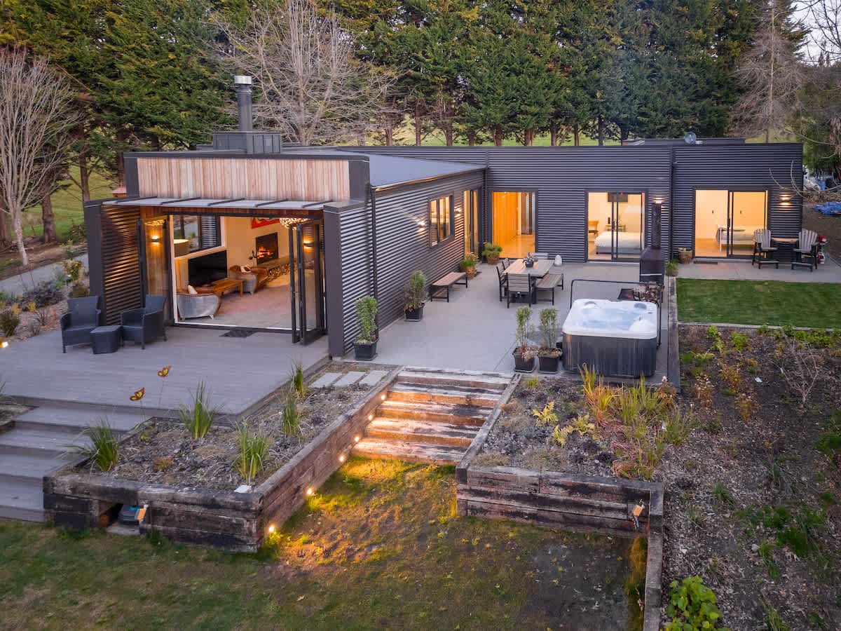 Fantastično | Utočište u šumi Izuzetna arhitektura, tiho i smešteno na privatnom hektaru zrele šume, 7 minuta od Mastertona. Savremeni smeštaj za bekstvo od svakodnevice, visoke klase, u osami, sa udobnošću tokom svih godišnjih doba Prostor: Čist, minimalistički enterijer sa tri spavaće sobe i dva kupatila (glavna spavaća soba sa sopstvenim kupatilom). Prostorije ispunjene svetlošću i pažljivo osmišljen dizajn Doživljaj: Vrtovi na terasama koji se menjaju sa godišnjim dobima. Opuštena večernja atmosfera u spa centru pod zvezdanim nebom Vajrarape ili pored vatre na otvorenom uz čašu vina