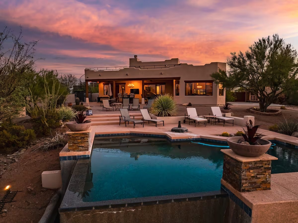 Prostrana prilagođena kuća u otmjenoj četvrti Ahwatukee u Finiksu. Mirna ulica u sklopu konjičkih imanja, a ipak samo 15-20 minuta do aerodroma Skaj Harbor, centra Finiksa i svih gradova Ist Veli. Objekat ima pogled na planine, novo zelenilo, bazen i igračke, 3 televizora. Spavajte do 16 osoba sa dovoljno prostora za lutanje! 5 spavaćih soba + potkrovlje, 4 kupatila, 4400 kvadratnih stopa, 15 kreveta + 1 na naduvavanje. Odlični restorani i kupovina u blizini. Jednostavan pristup autoputu I-10. Idealno za porodicu ili veliku grupu.