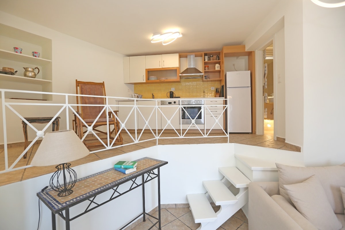 Potpuno opremljen jednosoban apartman sa pogledom na more. Jedan bračni krevet u spavaćoj sobi i 1 kauč u dnevnoj sobi, potpuno opremljena kuhinja (rerna, frižider-zamrzivač, mašina za sudove, 4), kupatilo sa tušem , mašina za veš, privatna terasa sa stolicama i stolom. Pristup zajedničkom dvorištu sa direktnim pristupom moru (stijenama) gdje gosti mogu da plivaju ujutro. Pogled na prednje more iz dnevnog boravka i spavaće sobe. Nekoliko koraka od centra Ermoupolisa.