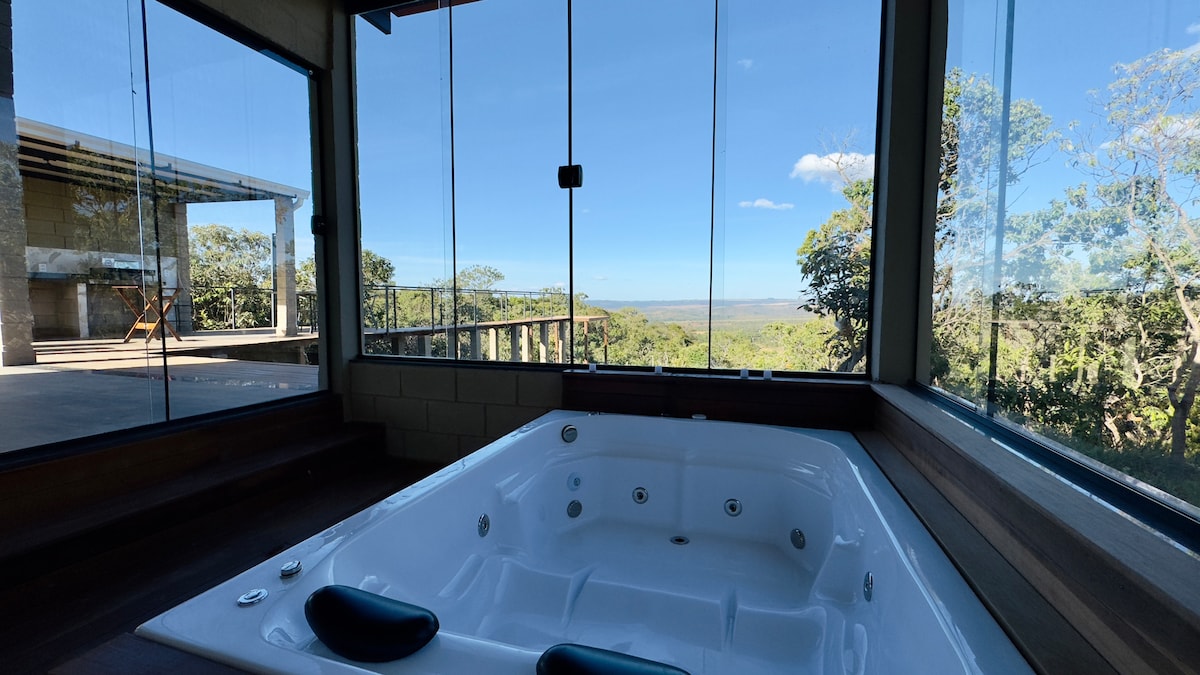 Microcasa madeira e beira do lago Paranoá, rústico, integrado a natureza e a topografia local, chegada lancha ou barco , Uber ou carro. Alta gastronomia disponível. Sauna úmida, piscina privativa aquecida temp média de 28 graus, ofuro e praça fogo. Vista inigualável. Atenção: compartimento vaso sanitário acessado escada e externo a casa. Chuveiro e pia interna casa, ar condicionado, Frigobar, Adega Climatizada, Cooktop 1 boca, Forno elétrico, Grill. Não indicado pessoas dificuldade locomoção.