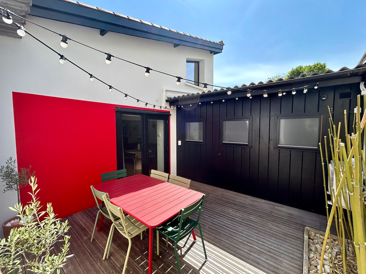 Kuća, savremeni dupleks koji može da primi do 6 osoba, nalazi se u srcu grada Andernosa. U blizini svih sadržaja (pristanište, plaže, restorani, prodavnice, natkrivena pijaca, gradska zabava, luke...) Na balkonima s pogledom na basen Arkašon. Predivni sadržaji, 2 kupatila, Wi-Fi u celom objektu. Clou de la Maison je na krovu:prelepa terasa sa bogatim baštenskim nameštajem i ležaljkama za sunčanje, van vidokruga.