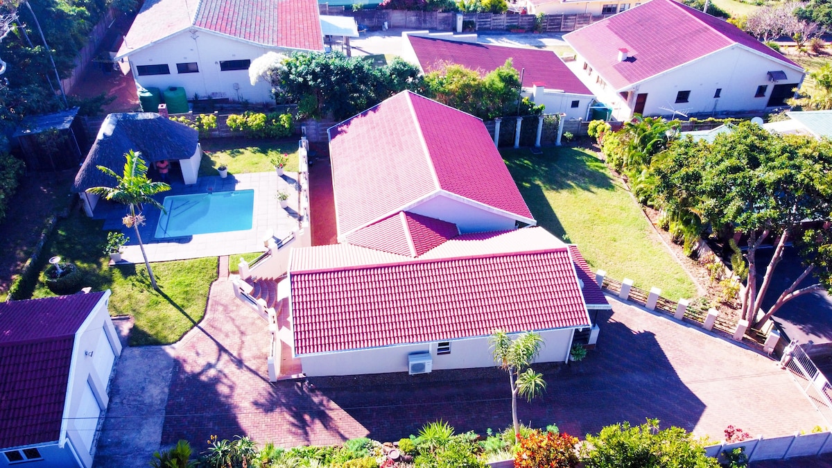 Pobjegnite u našu prostranu kuću za odmor s 4 spavaće sobe u Skoburgu, nedaleko od terena za golf i blizu plaže. Uživajte u potpuno opremljenoj kuhinji, udobnom salonu i prijatnom baru. Opustite se pored pjenušavog bazena ili se opustite u bujnom vrtu. Svaka spavaća soba nudi udobnost sa klima-uređajem, televizorima, a 3 imaju sopstvena kupatila. Prostor za zabavu i braai su savršeni za stvaranje uspomena sa voljenim osobama. Vaše mirno utočište uz obalu čeka - doživite toplinu i šarm ovog posebnog smještaja.
