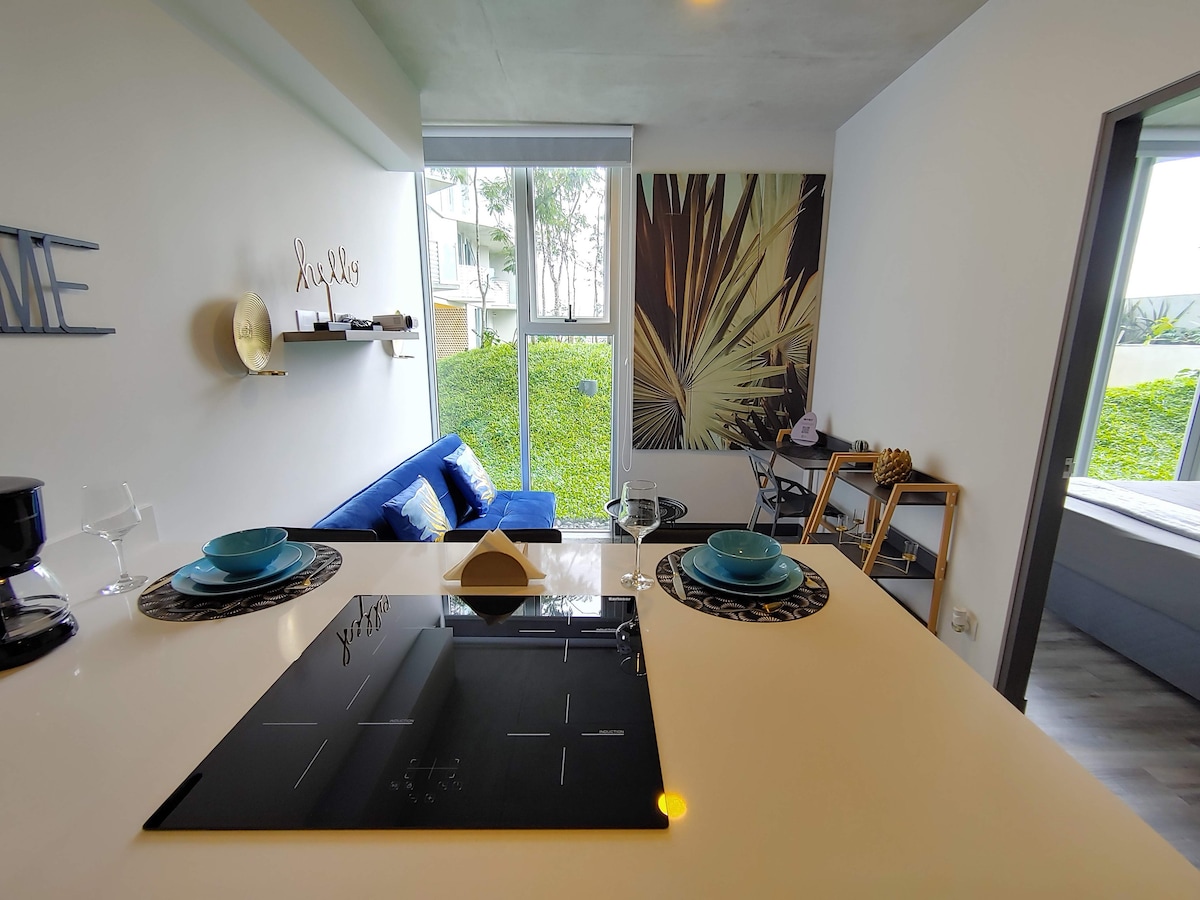 URBN Escalante (piso 24), una habitación, un baño completo,TV, plantilla de cocina de inducción, coffee maker, tostador, olla arrocera, balcón, cama matrimonial,utensilios de cocina, lavadora-secadora. Internet wifi de alta velocidad . El edificio ofrece piscina, gimnasio, salas de reuniones, sala de eventos, cine, lobby, cuarto de lavado, entre otros. VISITANTES no son permitidos