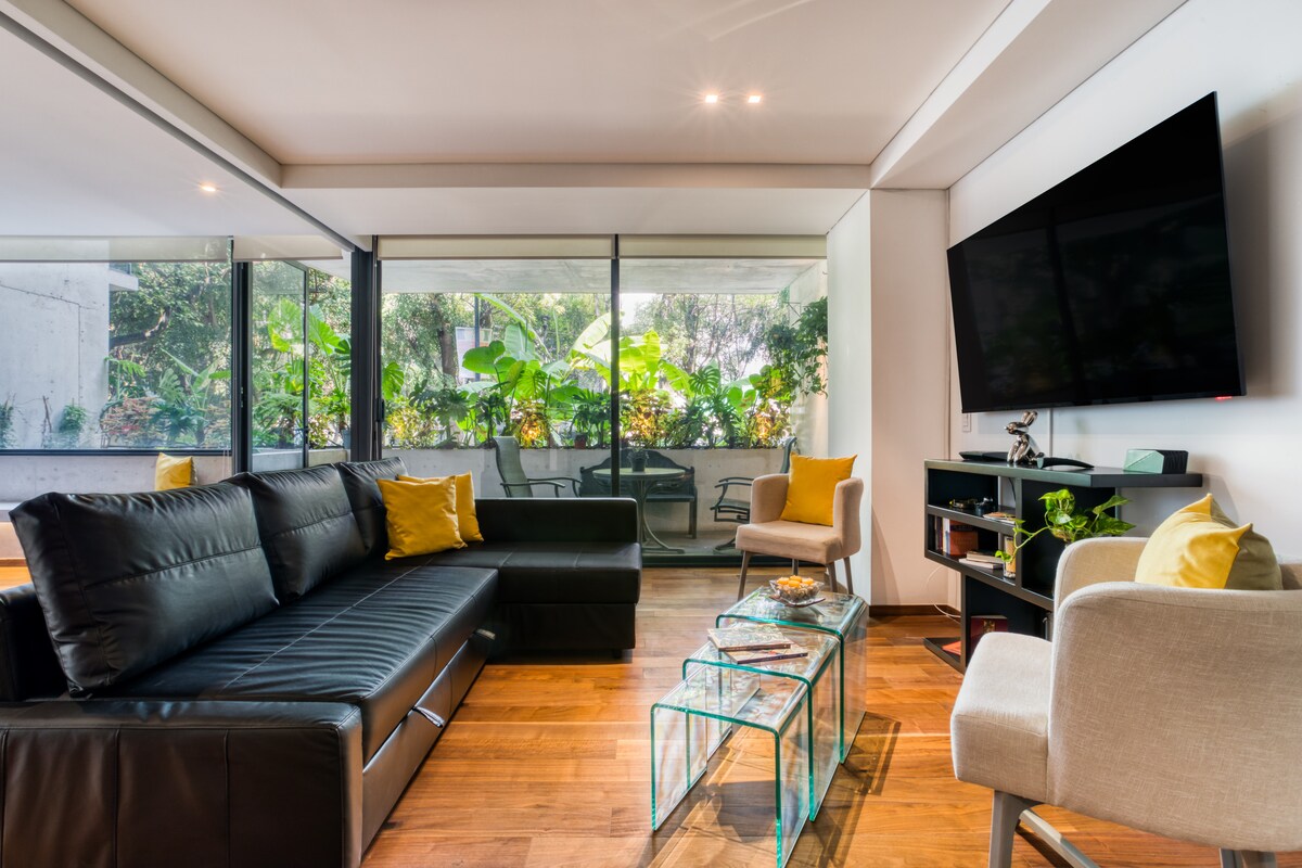 This one of a kind and cozy pent-house is located inside one of the most emblematic developments built in La Condesa neighborhood. Its architecture is a contemporary version of Art Deco. A style that defines La Condesa. It is located in a beautiful, tree-lined area. The atmosphere is very family-oriented, with young and vibrant people. The surroundings invite us to step out, walk, relax and discover new experiences.