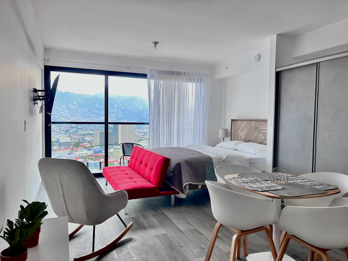 Prekrasan stan u potpunosti namješten na 19. spratu. Spektakularan pogled na planine i centar San Hozea. Nalazi se u najpopularnijoj četvrti San Hozea, sa svim sadržajima koji su vam potrebni za ugodan boravak u gradu. Ovo je idealna baza za istraživanje gradske četvrti Barrio Escalante, sa desetinama nezavisnih restorana, kafića i prodavnica na samo nekoliko koraka. Sadržaji u objektu obuhvataju: grejani bazen, teretanu, prostoriju za jogu, prostore za rad, vešernicu i još mnogo toga!