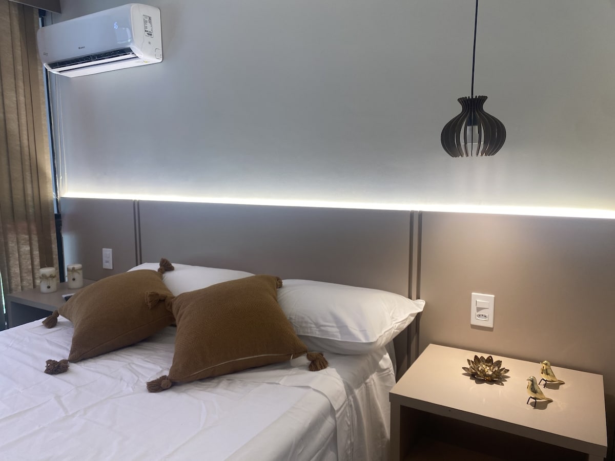 Moderan, novouređen i dobro uređen stan koji se nalazi u kulturnom i ekonomskom srcu glavnog grada, Asa Norte (SCLN 208). Opremljen najmodernijim i elegantnim, ovaj stan je idealan za one koji traže udoban i udoban boravak u Braziliji. Osjećajte se kao kod kuće u federalnoj prijestonici. - Privilegovana lokacija: u blizini restorana, pijaca, apoteka i nešto više od 5 minuta od centra grada. - Izuzetno brz Wi-Fi. - Klima-uređaj. - Vratar koji radi 24 sata.