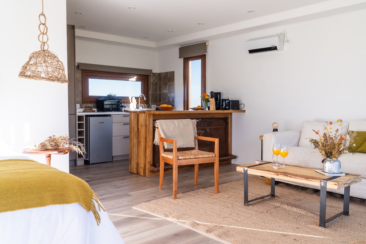 Sentite como en casa en esta cálida cabaña con vista al campo y la montaña. Ofrecemos check-in autónomo a partir de las 15 hs, sin restricciones en el horario de llegada. - Cuentas con 2 habitaciones, ambas con cama de dos plazas y estufas eléctricas. - 2 baños, uno en la habitación principal. - Living Comedor con una salamandra; te proporcionamos la leña. - Cocina totalmente equipada. - WI-Fi, Direct TV. - Estacionamiento techado para tu comodidad. ¡Las mascotas son bienvenidas! 🐶🦴