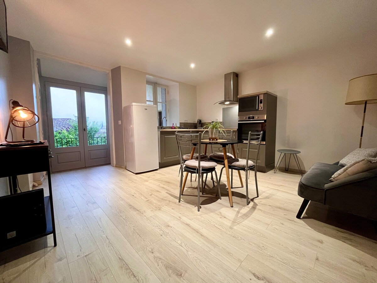 U srcu privatne seoske kuće Bastide de Monpazier koja je u potpunosti renovirana sa površinom od 60m² koja se nalazi na 1. spratu kuće vlasnika. Sastoji se od kupatila, kuhinje i velike spavaće sobe od 36 m2 sa balkonom . Drugi balkon s pogledom na baštu. Pristup svim prodavnicama (restorani, barovi, duvan, namirnice...) peške. Place des Cornieres je udaljen 50 metara. Idealna lokacija