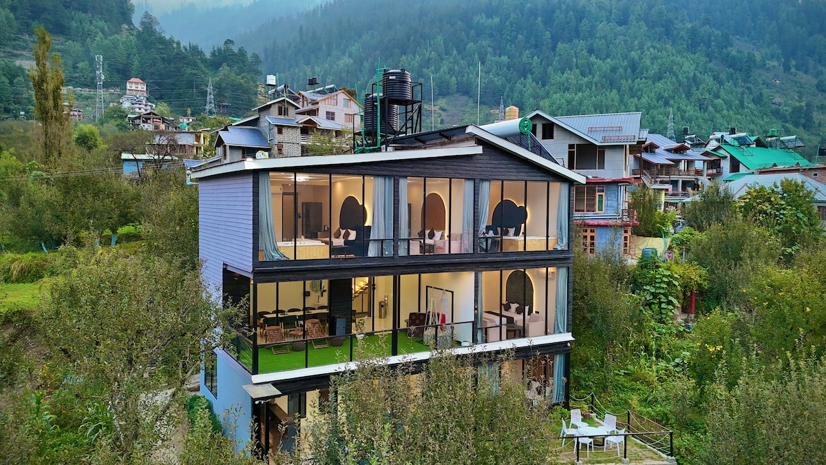 Take it easy at theVasoville Manali | Luxury Glass House Stay near Mall Road (3 km) with Mountain View Boutique Airbnb with 5 rooms including Jacuzzi rooms, AC rooms & balcony view. per Room max 3 guest with extra mattress. Enjoy panoramic Himalayan views, snow-capped mountains, infinity valley view, bonfire lawn, dining area & peaceful location. Ideal for couples, families & groups seeking a luxury homestay in Manali unique and tranquil getaway. 20-30 meter walk to the stay from road in orchid.