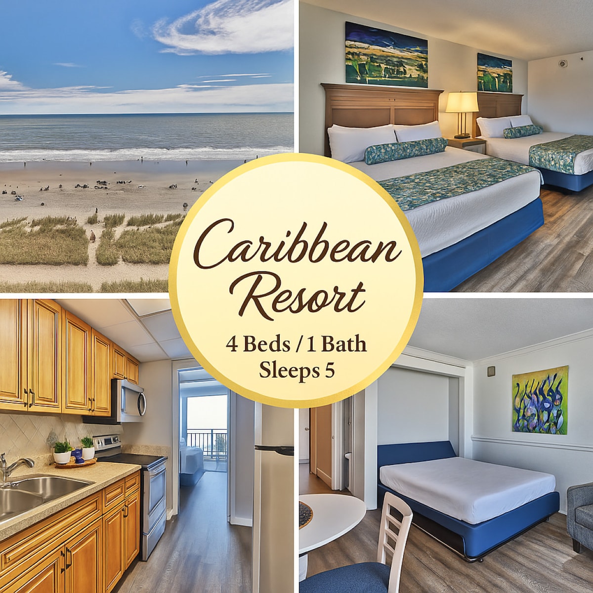 Stay Oceanfront at Caribbean Resort in Myrtle Beach! This updated condo has breathtaking ocean views from a private balcony, full kitchen, new appliances, custom walk-in shower, 55” Smart TVs, and free Wi-Fi. Enjoy resort amenities including pools, lazy river, hot tubs, and an onsite water park, with direct beach access steps away. Walk to restaurants and minutes from Broadway at the Beach, SkyWheel, shopping, dining, and Topgolf-perfect for spring and summer beach vacations and family getaways.