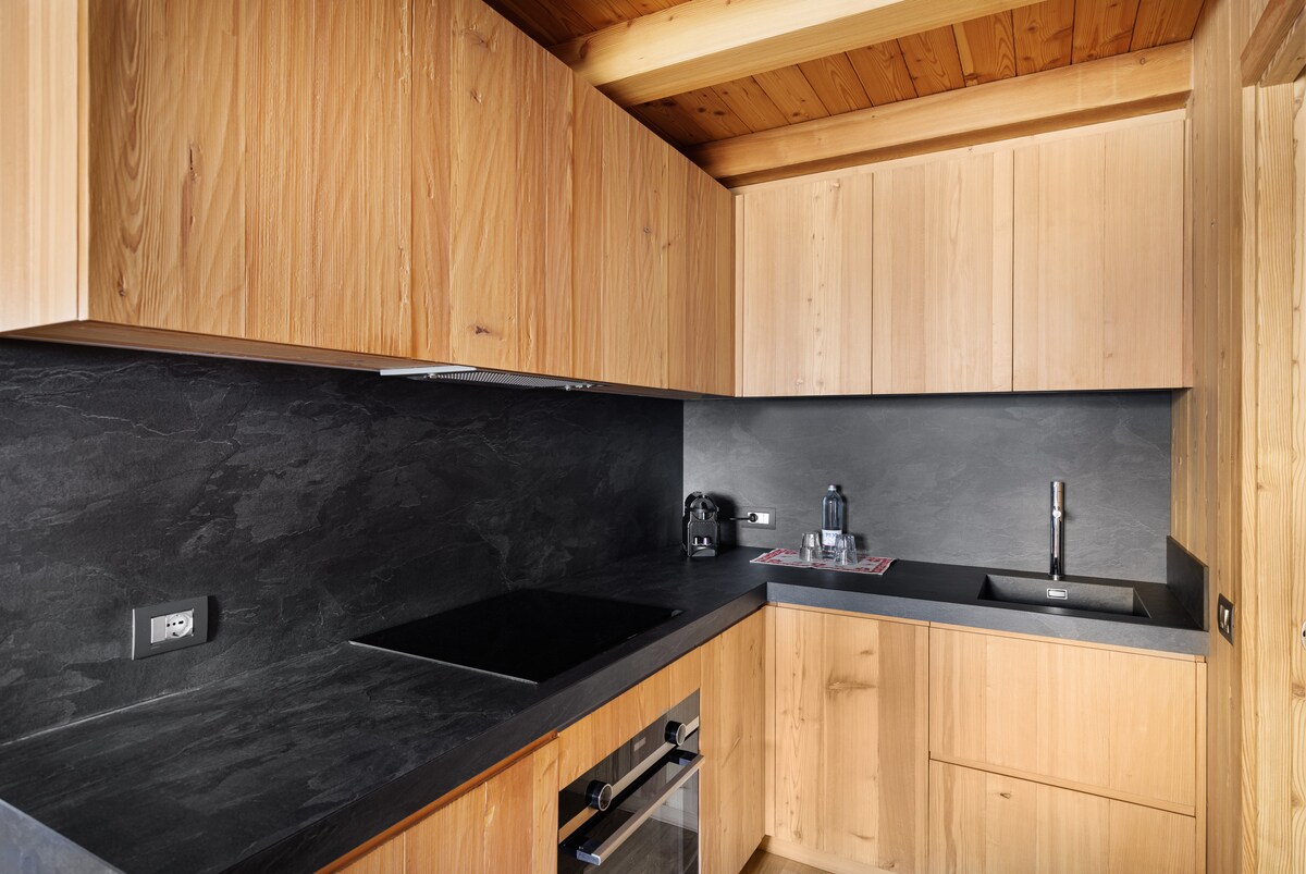 Luxury Chalet Maria located in the heart of the stunning Val di Peio, in the charming village of Celentino. This enchanting location offers breathtaking views of the Ortles Cevedale mountain range. This elegant residence provides a comfortable and modern living environment with a touch of Alpine style. The apartment features two spacious bedrooms and a finely finished bathroom equipped. The kitchen and living room blend into a bright open space, creating a cozy atmosphere with a modern design.